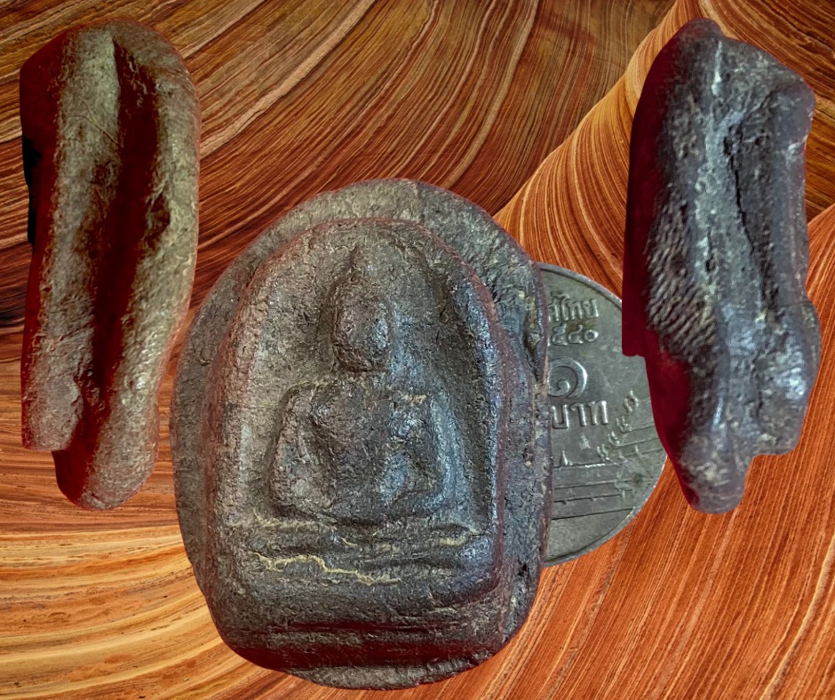 พระกำแพงซุ้มกอกรุหน้าศูนย์ กำแพงเพชร เป็นพระยุคกลางประมาณไม่เกิน 300 ปี บริเวณกรุอยู่เยื้อง ๆ จากลานทุ่งเศรษฐีเล็กน้อย คนส่วนมากไม่รู้จักเลยเหมารวมเป็นพระในลานทุ่งเศรษฐีหมด องค์นี้เป็นพิมพ์ใหญ่ไม่ตัดปีก ชาวบ้านเก็บมาจากบริเวณกรุไว้บนหิ้งพระเพิ่งบินลงมา ขนาด 2.5 x 3.2 ซม. 1,500.- บาทครับ.