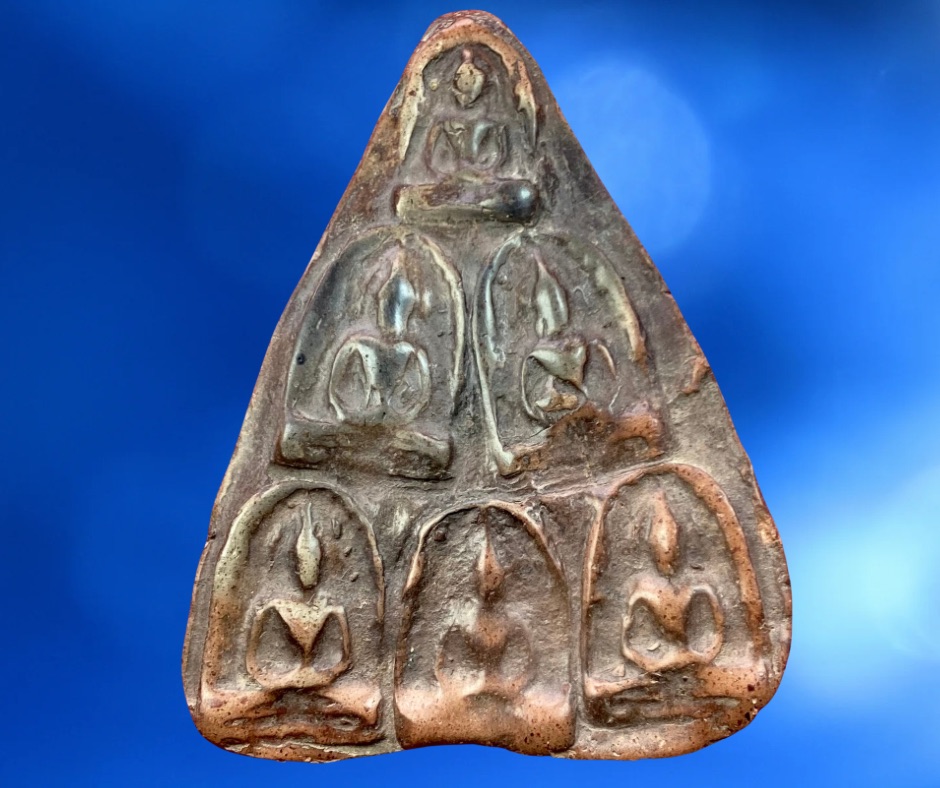 พระกำแพงซุ้มกอแผงกรุวัดกะโลทัย (ฝั่งเมือง) กำแพงเพชร พระซุ้มกอแผงเท่าที่ทราบมีสองกรุ ๆ วัดตะแบกลายและกรุวัดกะโลทัย วัดตะแบกลายเนื้อจะหยาบกว่าวัดกะโลทัย ในแผงจะมีพระซุ้มกอนั่ง 3 บ้าง 5 บ้าง 7 บ้าง 9 องค์บ้าง ที่เคยพบกรุวัดกะโลทัย 2 4 6 8 10 แผงที่นำมาเสนอนี้ท่านนั่งมา  6 องค์ สภาพ สวย สมบูรณ์ ขนาด 5 x 7 ซม. 1,000.- บาทครับ.