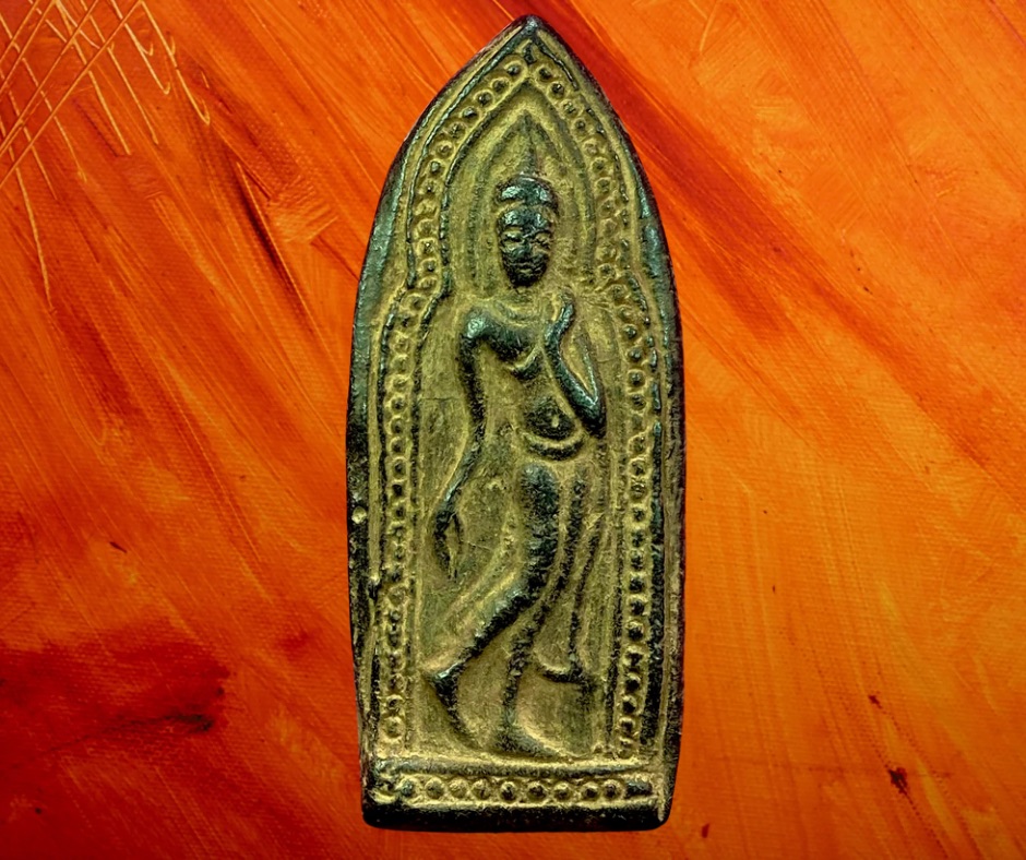 พระกำแพงลีลาเชยคางข้างเม็ดเนื้อชินเงิน กรุวัดพระบรมธาตุ กำแพงเพชร