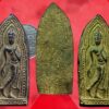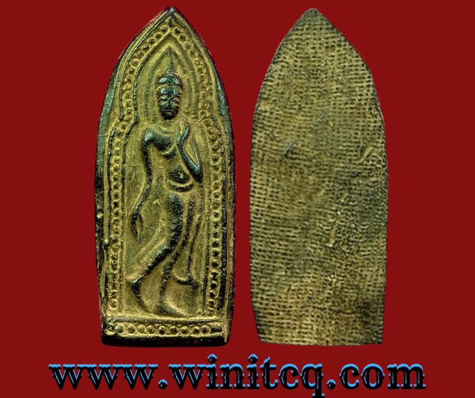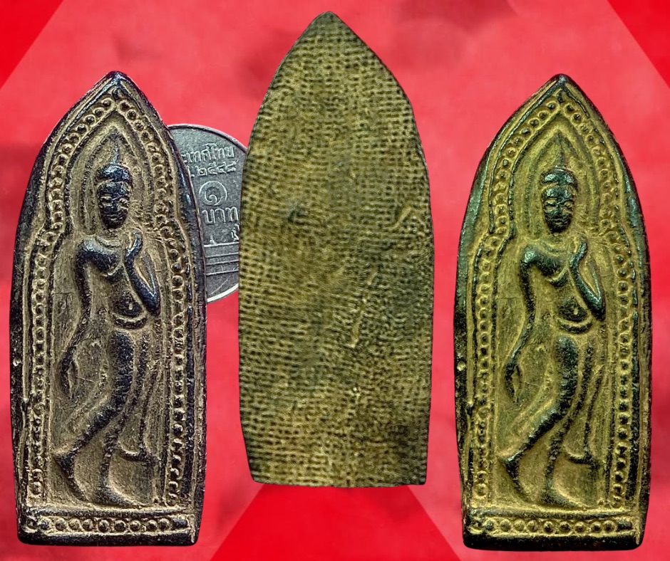 พระกำแพงลีลาเชยคางข้างเม็ดเนื้อชินเงินหลังลายผ้า กรุวัดพระบรมธาตุ กำแพงเพชร พระที่พบในกรุวัดบรมธาตุและกรุในบริเวณทุ่ง ฯ จะมีผิวสีดำตีนกาเป็นส่วนใหญ่ ส่วนฝั่งเมือง ฯ กรุวัดอาวาสน้อยและกรุวัดสี่อิริยาบถ มักจะมีผิวปรอทติดอยู่ค้างหลงเหลืออยู่บ้าง พบสามพิมพ์ ใหญ่ กลาง เล็ก องค์นี้เป็นพิมพ์กลางขนาด 2 x 5 ซม. 2,000.- บาทครับ.
