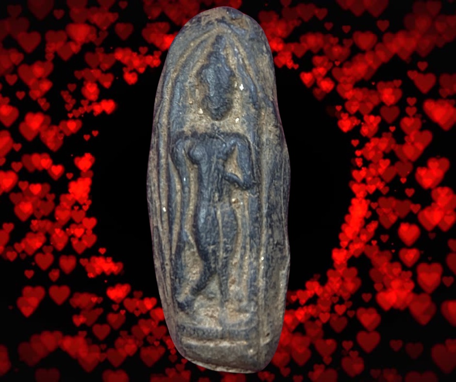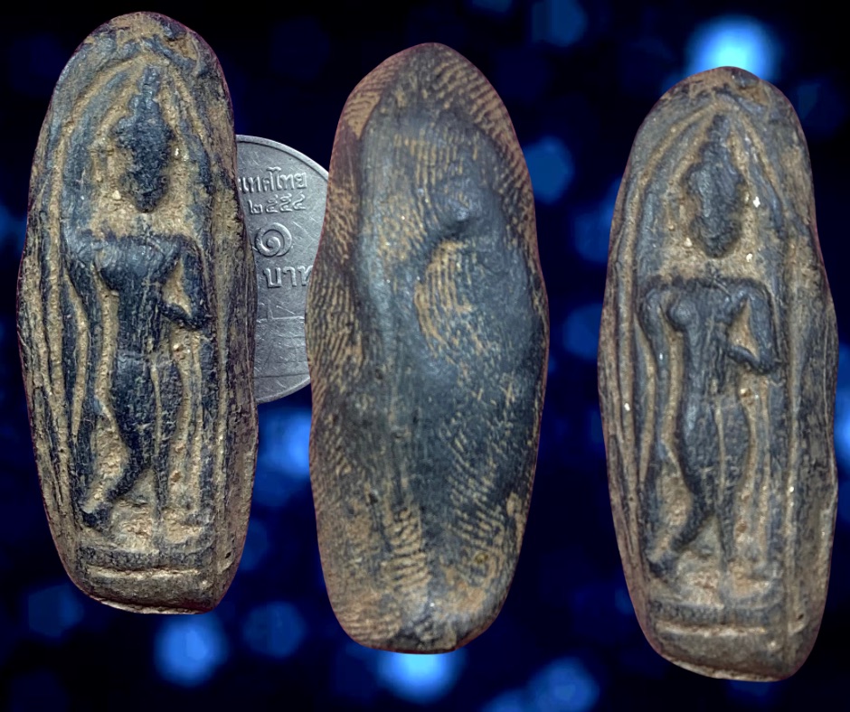 พระกำแพงเม็ดขนุนกรุวัดซุ้มกอ กำแพงเพชร พระเม็ดขนุนพบมากหลายกรุทั้งฝั่งเมืองและฝั่งทุ่งเศรษฐี ค่านิยมฝั่งทุ่ง ฯ จะมากกว่าเพราะความนุ่มนวลของเนื้อพระ เมืองนครชุมเก่ามีบริเวณกว้างใหญ่ พบซากโบราณสถานมากมาย มีชื่อวัดชื่อกรุที่พบพระเม็ดขนุนหลายกรุ.- กรุวัดพิกุล กรุวัดพระบรมธาตุ กรุตาพุ่ม กรุนาตาคำ กรุฤาษี กรุวัดซุ้มกอ กรุเจดีย์กลางทุ่ง และอีกหลายกรุที่พบในทุ่งหาสังกัดไม่ได้ก็เรียก “กรุลานทุ่ง” “กรุกลางทุ่ง” หรือ “กรุทุ่งเศรษฐี” องค์ที่นำเสนอนี้เนื้อสีดำขึ้นทึ่กรุวัดซุ้มกอเมื่อก่อนเป็นพิมพ์เล็ก ปัจจุบันบางท่านว่าเป็นพิมพ์กลางเพราะเคยเจอพิมพ์ที่เล็กกว่าอีก (หลายท่านมองข้ามว่าเนื้อดำไม่มี) สวยมาเดิม ๆ ขนาด 1.8 x 4.0 ซม. 2,500.- บาทครับ.