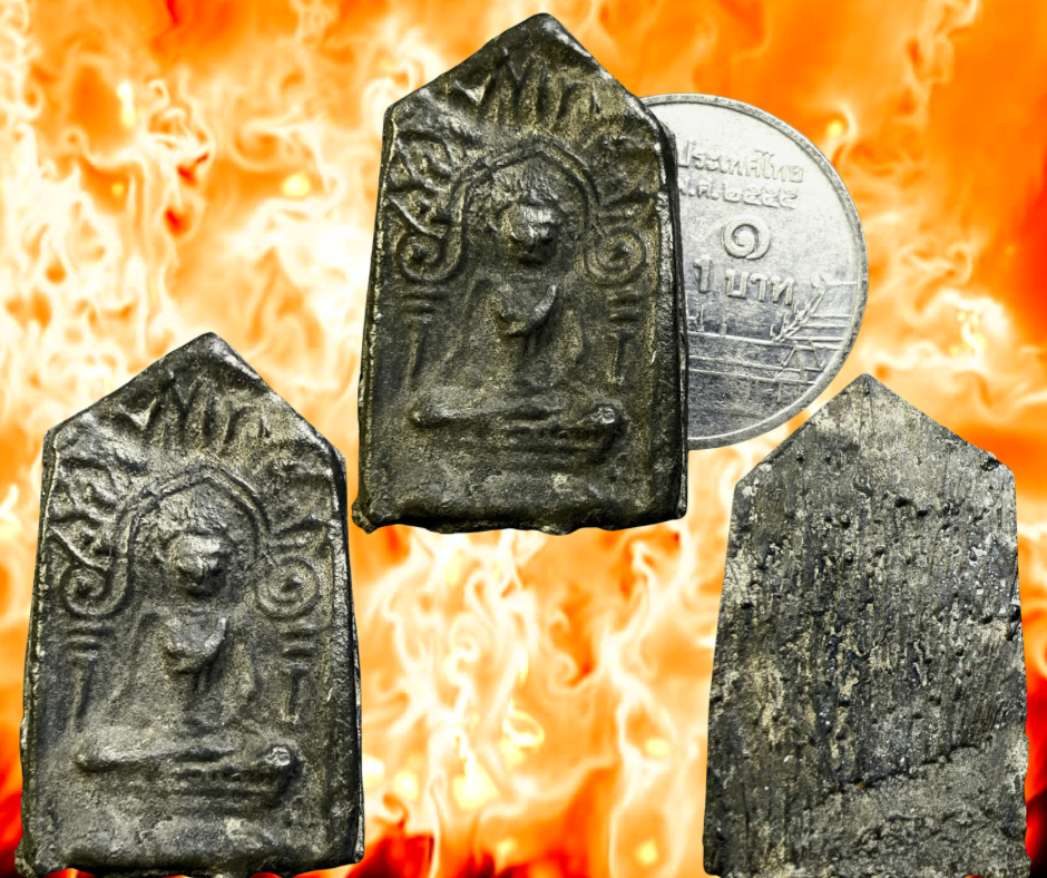 พระซุ้มเรือนแก้ว (กระต่ายแกลบ) เนื้อชินเงิน กรุเขาพนมเพลิง สุโขทัย เขาพนมเพลิงมีการขุดพบพระมากมายหลายจุดและหลายครั้งส่วนใหญ่จะเป็นพระเนื้อชินเงินผิวปรอท สำหรับพระกรุกระต่ายแกลบมีตำนานเก่าเล่าว่า นายพรานได้ไล่ล่ากระต่ายป่าตัวหนึ่งเข้าไปในโพรงดินและได้ยิงปืนใส่กระต่ายตัวนั้นหลายที แต่ก็ยิงไม่ออก จึงเข้าไปสำรวจดู พบพระเนื้อชินเงินปรอทขาวลักษณะคล้ายพระพุทธชินราชจำนวนมาก….. พระองค์ที่นำมาเสนอนี้เป็นพิมพ์กลางกระต่ายแกลบมีสามพิมพ์ (ใหญ่ – กลาง – เล็ก ) สภาพเดิมสมบูรณ์จากกรุไม่ผ่านการใช้ ผิวดำไม่มีปรอท ขนาด 1.5 x 2.5 ซม. ประกันพระแท้ 1,000.- บาทครับ.