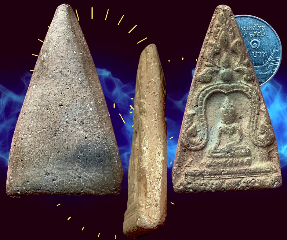 พระซุ้มคอระฆังหรือพระเสมาทิศ กรุวัดอรัญญิก พิษณุโลก พบครั้งแรกที่วัดอรัญญิกเมื่อปี 2450 ทั้งเนื้อดินและเนื้อชิน ปี 2496 เปิดกรุครั้งใหญ่ได้พระมายมายและหลังปี 2500 ก็ยังพบอีก รวมแล้วมากกว่า 20 พิมพ์ ๆ ที่มีมากที่สุดคือซุ้มระฆัง องค์ที่นำมาเสนอนื้เป็นเนื้อดินสภาพ ขนาด 3.0 x 4.5 ซม. 1,250.- บาทครับ.