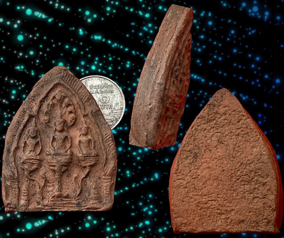 พระตรีกายเนื้อดินพิมพ์ฐานบัวก้าน กรุวัดด่านติง อ.โนนสูง นครราชสีมา เป็นพระศิลปะขอม ขุดพบเมื่อปี 2535 จำนวนไม่มากนักบรรจุอยู่ในไหโบราณร่วมกับพระนาคปรก ทางวัดนิมนต์พระเกจิย์ ฯ ในจังหวัดนครราชสีมาร่วมพิธีพุทธาพิเศกจำนวน 9 รูป … 1.หลวงปู่แจ้ง วัดใหม่สุนทร 2.หลวงปู่คง วัดตระคร้อ 3.หลวงปู่อินทร์ วัดบัว 4.หลวงพ่อดี วัดหนองจอก 5.หลวงพ่อพุธ วัดป่าสาละวัน 6.หลวงพ่อคูณ วัดบ้านไร่ 7.หลวงปู่นิล วัดครบุรี 8.หลวงพ่อจอย วัดโนนไทย 9.……….. พระกรุนี้พบเจอน้อยไม่ค่อยมีมาหมุนเวียนในสนาม พิมพ์นี้เคยขึ้นที่ลพบุรีและสุโขทัยมาก่อนแต่คนละโซนสีเนื้อ องค์ที่นำมาเสนอนี้ขนาด 3.5 x 4.5 ซม. สภาพสมบูรณ์ 1,000.-บาทประกันแท้ครับ