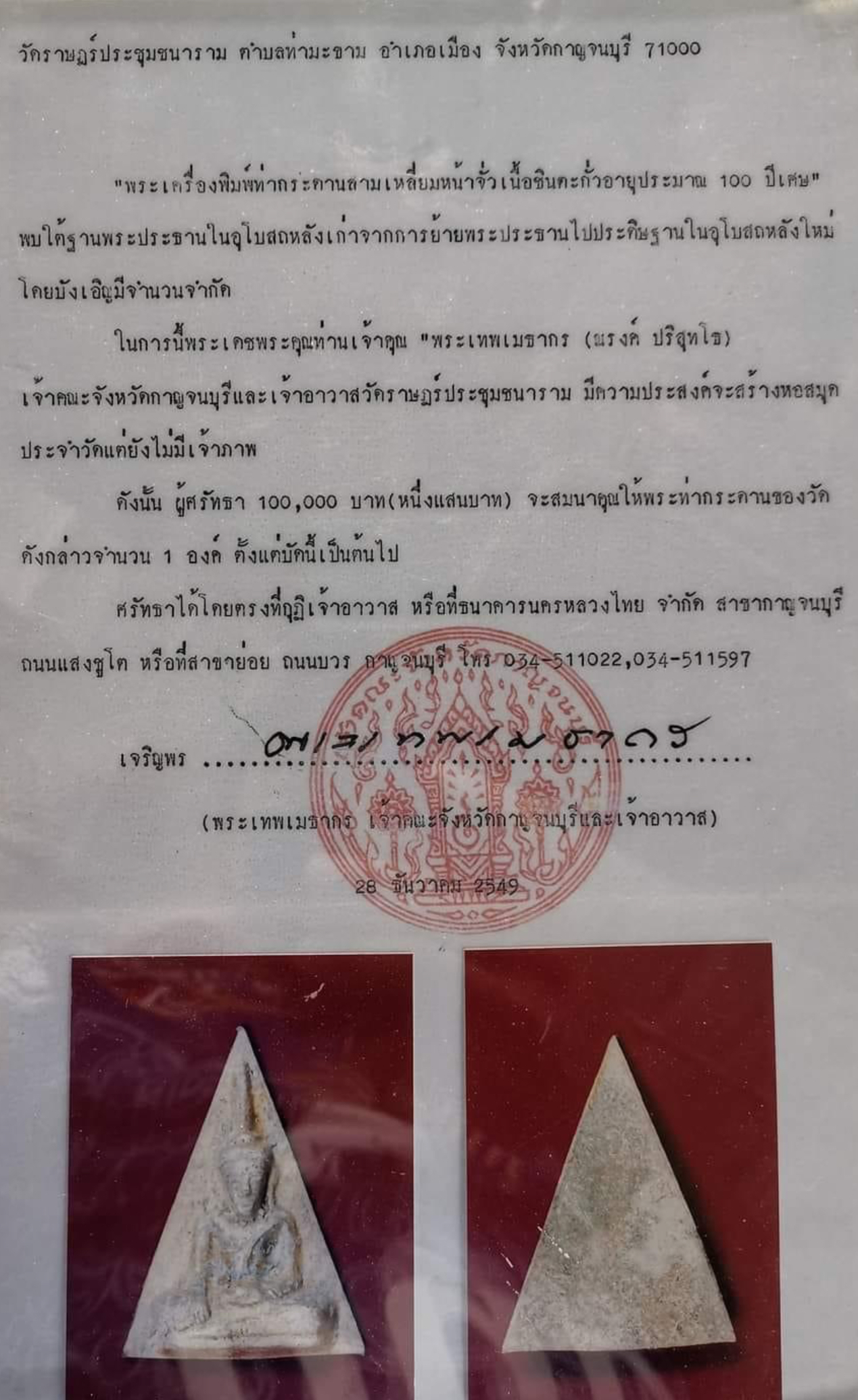 พระท่ากระดานกรุวัดท่ามะขาม กาญจนบุรี เนื้อตะกั่วสนิมไข สนิมแดง ปิดทองเก่าแทบทุกพิมพ์ วัดท่ามะขามสร้างในสมัยอยุธยา ร.5 เสด็จเมืองกาญจน์ ฯ เห็นวัดทรุดโทรมจึงสั่งให้ทะนุบำรุงซ่อมแซมให้ใหม่ และเมื่อปี 2549 ทางวัดได้สร้างโบสถ์ใหม่แล้วย้ายพระประธานองค์เก่า มาประดิษฐ์สถานที่โบสถ์หลังใหม่ ก็พบพระบรรจุไว้ที่ฐานพระประธานมากมายหลายหลากพิมพ์ จึงได้ออกให้ทำบุญเพื่อมาสร้างอาคารของวัด 100,000.- บาทจะได้รับพระท่ากะดาน 1 องค์ ส่วนหนึ่งก็ได้นำบรรจุไว้ใต้ฐานเหมือนเดิม ผู้สันทัดกรณีพิจารณาจากเนื้อหาแล้วชี้ชัดว่าพระพิมพ์ต่าง ๆ มีอายุแตกต่างกันไป พระอาจจะไม่ได้สร้างในยุคเดียวกันทุกพิมพ์. …องค์ที่นำมาเสนอนี้เป็นพระท่ากระดานพิมพ์ใหญ่ปิดทองในกรุ สภาพเดิมเต็มร้อยเนื้อเกินไม่ตัดปีก ประกันแท้ 2,000.- บาทครับ.