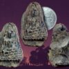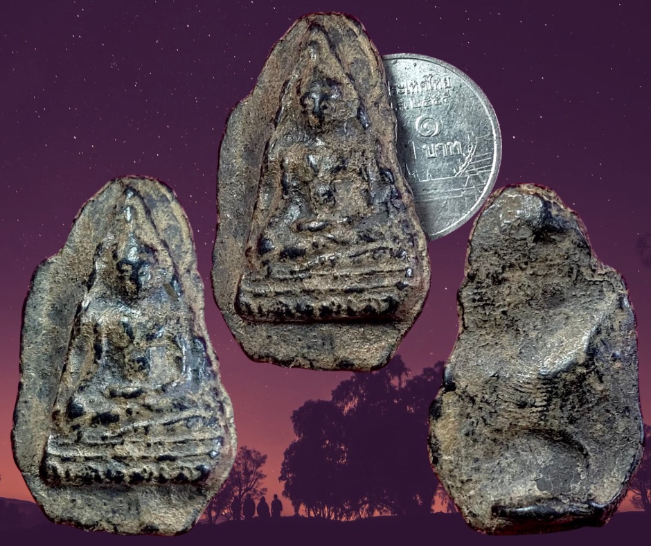 พระกำแพงท่ามะปรางเนื้อดินกรุวัดป่ามืด กำแพงเพชร พระท่ามะปรางเป็นพระพิมพ์หนึ่งที่นิยมมากทุกกรุทุกจังหวัด ขึ้นจากกรุครั้งแรกที่วัดท่ามะปราง พิษณุโลก เนื่องจากพระปรางในวัดพังทะลายลงมาพบพระทั้งเนื้อดินและชินเงินในสมัย ร.5 แจกทหารไปรบกับเงี้ยวถูกกระสุนเงี้ยวล้มคว่ำลุกมายิงกับเงิ้ยวอีกจนเงี้ยวทิ้งปืนวิ่งหนี จึงได้รับฉายาว่า “พระท่ามะปรางกรุเงี้ยวทิ้งปืน” พระท่ามะปรางองค์นำเสนอนี้สีดำไม่ตัดปีกสภาพสมบูรณ์ขึ้นที่กรุวัดป่ามืด ขนาด 2 x 4 ซม. 2,000..- บาทครับ.