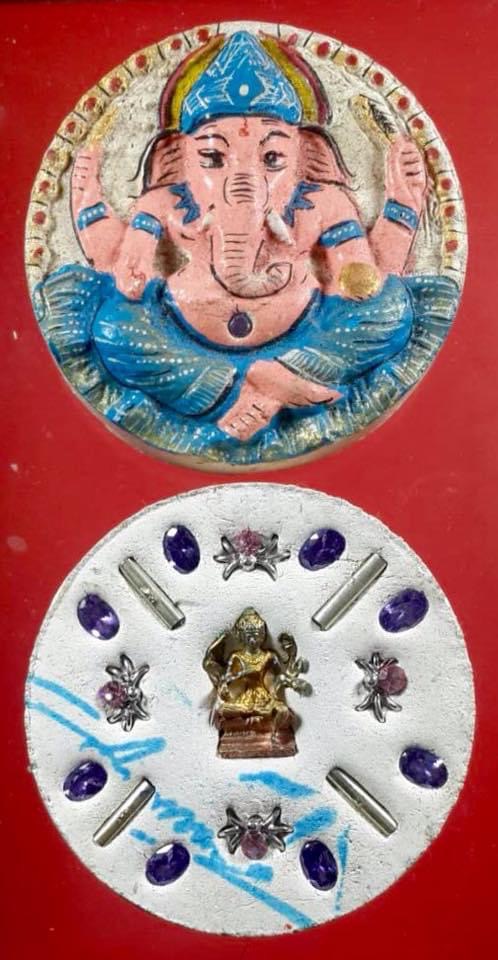 พระพิฆเนศวร โอม ศรี คเณศายะ นะมะฮา ข้าพเจ้าขอบูชาพระพิฆเนศ สาธุ พระพิฆเนศได้รับคำยกย่องให้เป็นเทพเจ้าแห่งความสำเร็จ ปราศจากอุปสรรคทั้งมวล บูชาพระพิฆเนศจะพบแต่สิ่งดี ๆ ประกอบกิจการใดก็ประสพผลสมหวังดังต้องการ พระพิฆเนศพิมพ์นี้ครูบา ฯ ท่านสร้างชุดแรกออกให้บูชาเมื่องานสงกรานต์ 2554 ชุด ๆ นี้เป็นชุดที่สองสร้างเข้าพิธีกรรมฐานเจ็ดวันปี 2555 แบบหลังเรียบสำหรับแจกเมื่อออกกรรมฐานจำนวนหนึ่งลังกระดาษ และที่ออกให้บูชาด้านหลังจะฝังพระพรมเทพธาดาชุบสามกษัตริย์ ฝังพลอยสีล้อมรอบ และฝังตะกุดเงินรูปตัวคูณ สี่ดอกคูณสี่ทิศ size 5 Cm. 1,300.- พร้อมส่ง Ems. ครับ.