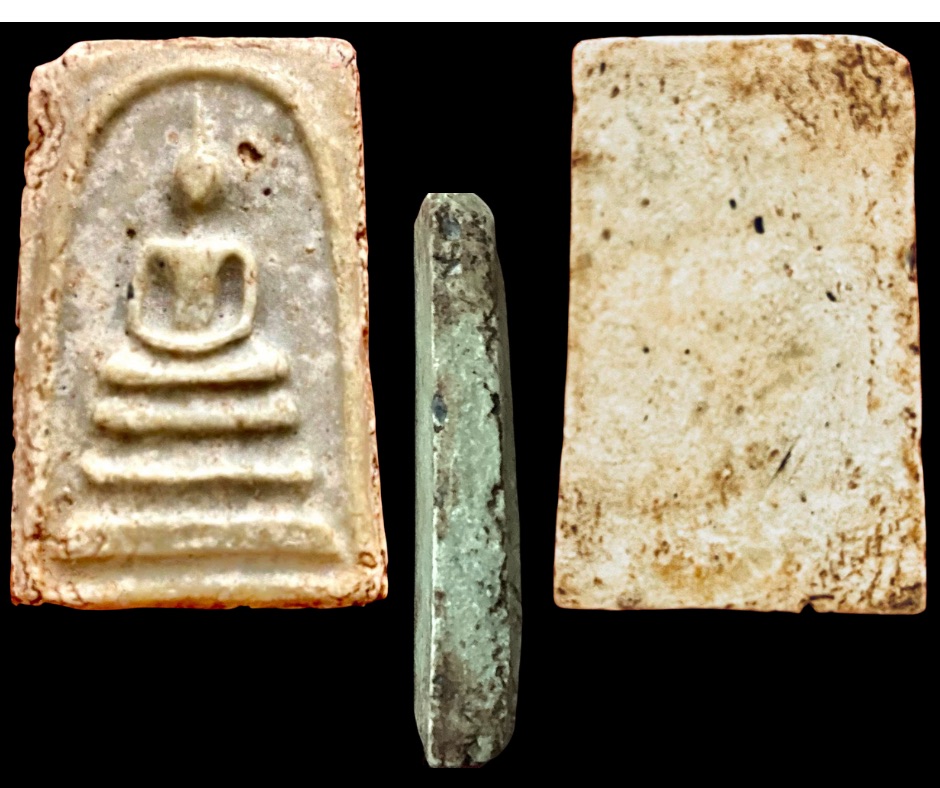 ช่วงแรก ๆ ก็สร้างไปเรื่อย ๆ ว่างก็เกณฑ์ลูกศิษย์มากด เนื้อพระจึงมีความหลากหลายแต่คล้ายกัน สร้างไปแจกไป ยุคแรกใส่ตุ่มใหญ่ฝังไต้ต้นโพธิ์บริเวณหน้ากุฏิท่าน สร้างต่อมาใส่ตุ่มน้ำมนต์ (ลายมังกร) หน้ากุฏิท่านโดยนำเศษผงสมเด็จที่ตำละเอียดแล้วโรยทับด้านบน และสร้างแจกเรื่อยมา องค์นี้เป็นพิมพ์เกศจดซุ้ม (พิมพ์หนึ่งในหลายแม่พิมพ์) พบเศษสมเด็จปะปนอยู่มากและคราบดินขี้กรุ นำเสนอ 1,500.- บาทครับ.