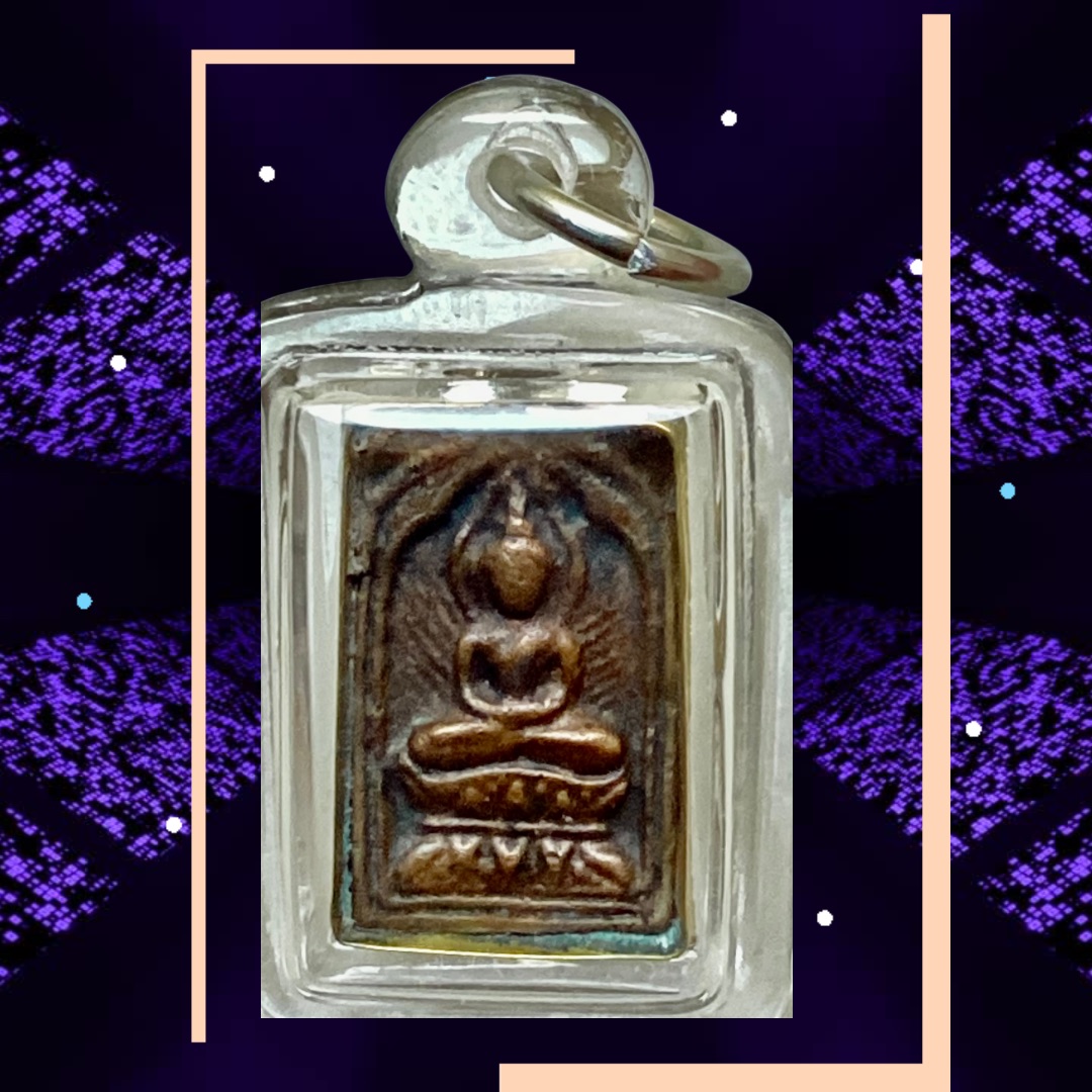 พระพิมพ์สี่เหลี่ยมประภามณฑลข้างรัศมีเนื้อทองผสม หลวงปู่ศุข วัดปากคลองมะขามเฒ่า ชัยนาท หลวงปู่ศุขท่านสร้างพระพิมพ์สี่เหลี่ยมประภามณฑลก่อนปี 2450 ส่วนมากมักจะทําด้วยเนื้อตะกั่วผสมปรอท เพราะเป็นวัสดุที่หาได้ง่าย ทําได้ครั้งละจํานวนมาก …เนื้อทองแดงผสมหลวงปู่ศุขสร้างประมาณปี 2460 ในปลายอายุขัยของท่านสร้างจำนวนน้อย ที่สําคัญได้ช่างออกแบบพิมพ์จากช่างหลวงที่พระองค์เจ้ากรมหลวงชุมพรเขตอุดมศักดิ์ ท่านทรงให้ออกแบบและมอบทองแดงให้มาสร้างในครั้งนี้ องค์นำเสนอนี้ปัจจุบันเรียกเนื้อทองแดงเถื่อนพระถูกเลี่ยมเงินจับขอบใช้มาเก่าเพิ่งเลี่ยมพล๊าสติกกันน้ำใหม่ ท่านธุดงค์มาจากบริเวณวัดสิงห์ ขนาด 1.5 x 2.0 ซม. 3,000.- บาทครับ.