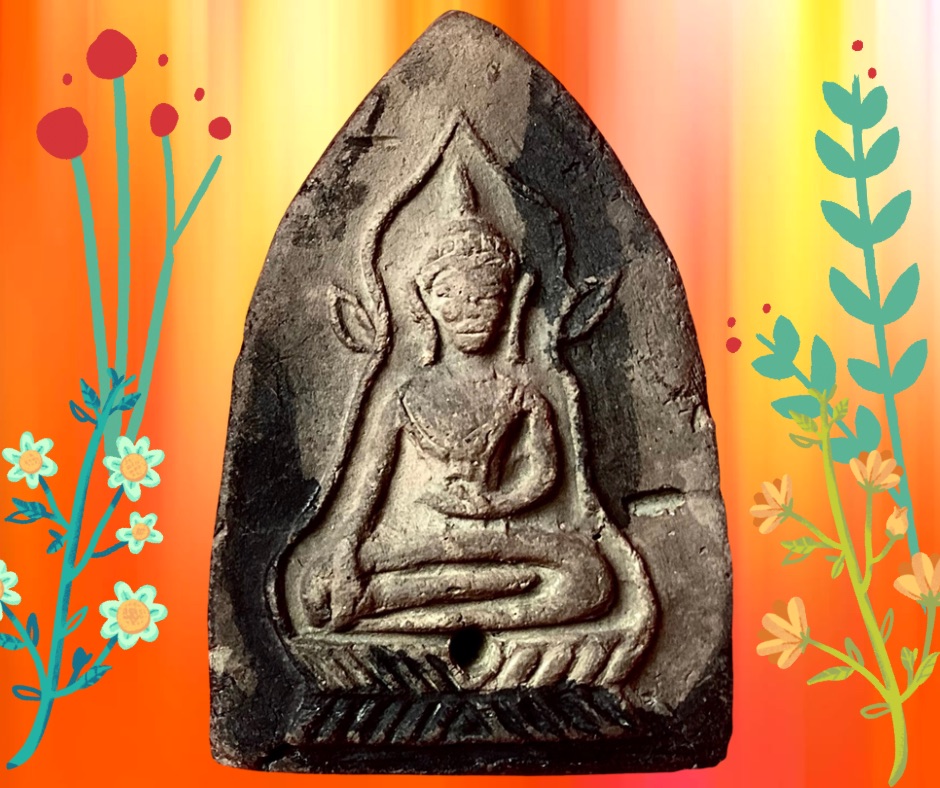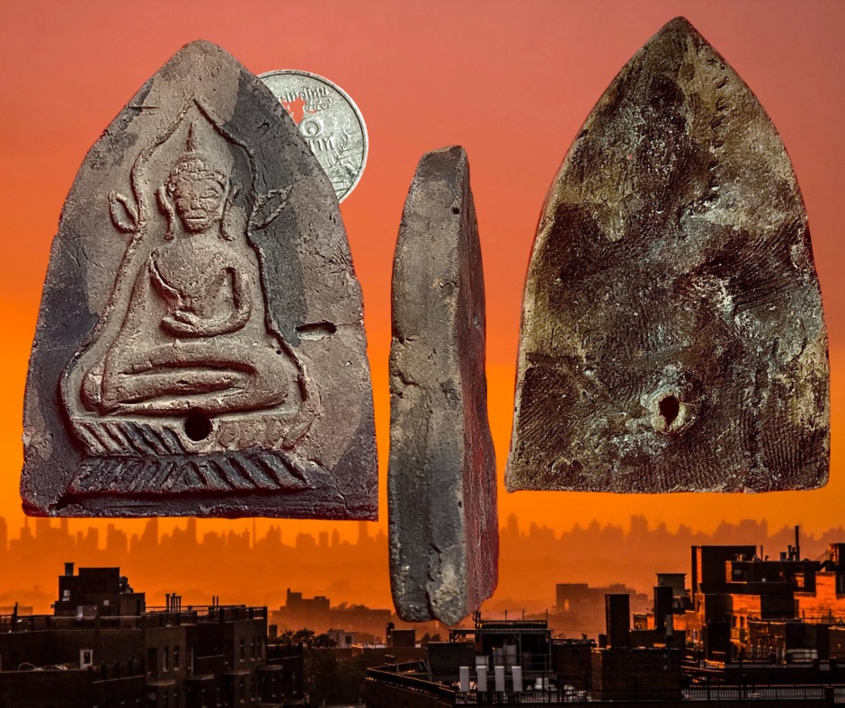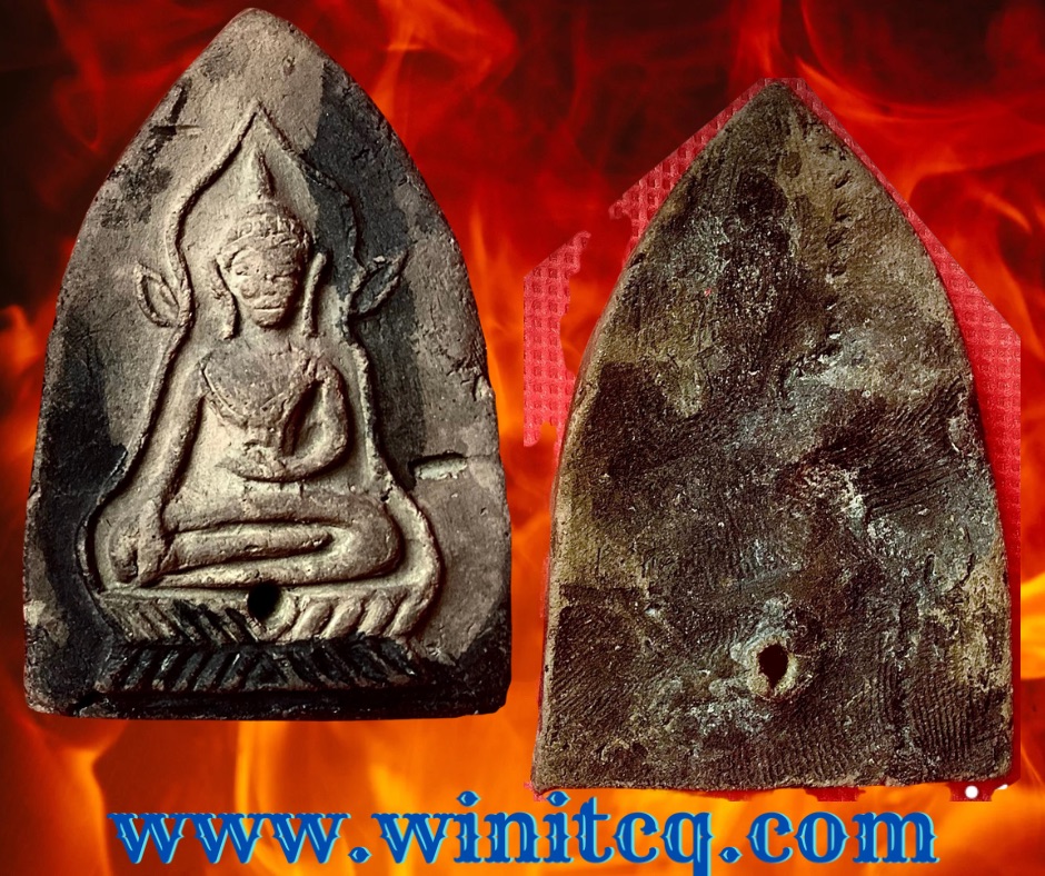 พระพุทธชินราชเนื้อดินเผา กรุวัดเขาพระศรี สุโขทัย วัดเขาพระศรีสร้างมาตั้งแต่ปี พ.ศ.1800 มีพระฝ่ายอรัญวาสี (พระป่า) ปกครองอยู่ ได้สร้างพิมพ์พระขึ้นตามพระประสงค์ของพญาลิไท โดยให้ช่างพื้นบ้านแกะแม่พิมพ์ ใช้พระพุทธชินราชเป็นต้นแบบ นำมวลสารวิเศษต่าง ๆ เช่น.- ดิน, สมุนไพร, ว่านยา, ผงวิเศษจากการเขียนอักขระ เลขยันต์ ผสมนวดปั้น กดลงพิมพ์ด้านเดียว ผึ่งให้แห้ง นำไปเผาที่เตาทุเรียงซึ่งอยู่ในบริเวณใกล้เคียง แล้วเข้าพิธีพุทธาภิเษก นำบรรจุกรุ เพื่อสืบทอดพระพุทธศาสนา พุทธคุณเมตตา, บารมี, มหาอำนาจ, แคล้วคลาด, คงกระพัน องค์ที่นำมาเสนอนี้เจ้าของเก่าเขาใช้สว่านเจาะตะปูควงติดข้างฝาบนหัวนอนไว้นานปีสภาพหย่อนความงาม ขนาด 4.0 x 5.5 ซม. 800.- บาทครับ.