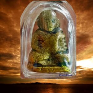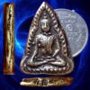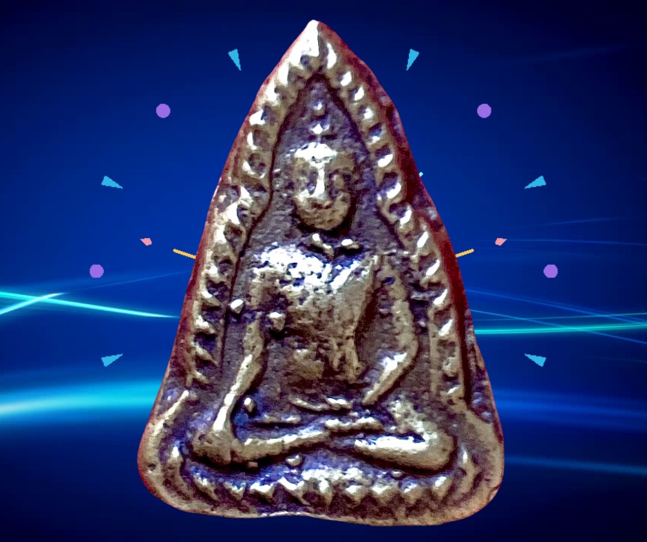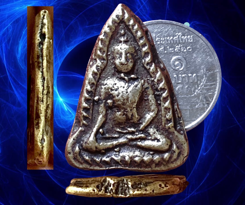 พระพุทธชินราชหล่อเนื้อทองผสมพิมพ์เข่าจม หลวงพ่อเงิน วัดดอนยายหอม นครปฐม เป็นพระที่จัดสร้างขึ้นในยุคแรก ๆ ของหลวงพ่อเงินโดยการจัดสร้างและหล่อพระกันในวัดดอนยายหอม ช่วงแรกปี 2480 คนในพื้นที่บอกว่าสร้างไม่ต่ำกว่า 3 ช่วง ๆ สอง 2490 – 2500 ช่วงสาม ปี 2517 เป็นพระบรรจุกล่องพิมพ์จะตื้น (พระถอดพิมพ์) ยุคแรกกระแสเนื้อโลหะจะออกแดง เป็นพระหล่อช่อเบ้าปะกบ มีเนื้อทองผสมและเนื้อแร่ พบทั้งหลังยันต์และหลังเรียบ (เขาว่าหลังเรียบออกที่วัดโพธิ์) ขนาด 2 x 3 ซม. 1,500.- บาทครับ.
