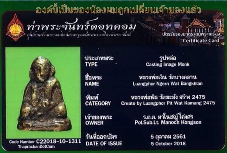 พระรูปหล่อหลวงพ่อเงิน วัดบางคลาน จ. พิจิตร พระชุดนี้เทหล่อแบบโบราณหลวงพ่อพิธ วัดฆะมัง เป็นผู้สร้างและปลุกเสก เมื่อปี ๒๔๗๕ เอกลักษณ์ของพระชุดนี้ มือข้างขวาถือถุงเงิน ข้างซ้ายถือบาตร ใต้ฐานหล่อยันต์ นะ มะ พะ ทะ จำนวนสร้างน้อยมาก หาชมได้ยาก ส่วนมากที่พบจะหล่อไม่สมบูรณ์เหมือนองค์นี้ หลวงพ่อพิธตาไฟคือฉายาท่าน เพราะดวงตาท่านเผาไม่ไหม้ ดวงตาท่านบรรจุไว้ที่รูปเหมือนท่านที่วัดฆะมัง 8,000.- บาทครับ.