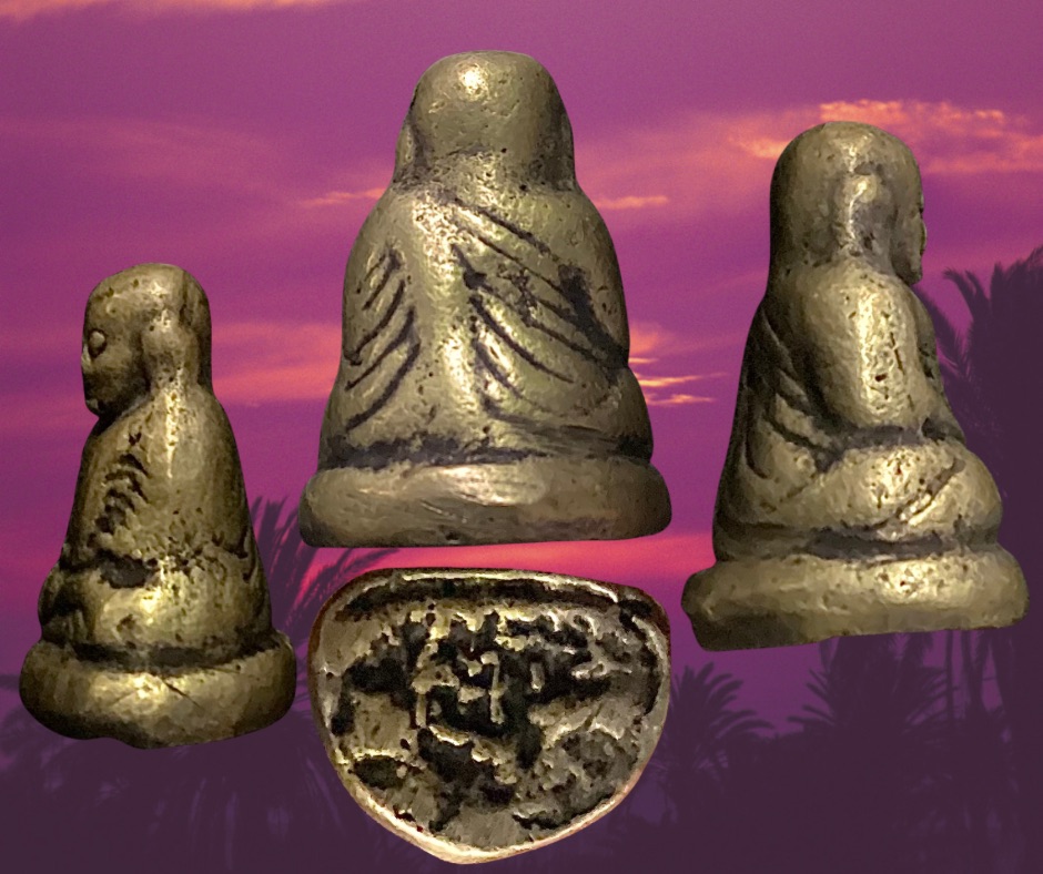 พระรูปหล่อหลวงพ่อเงิน พิมพ์ขี้ตา เข่าบุ๋ม แข้งจุด ก้นมะระ วัดทุ่งน้อย พิจิตร สร้างจากเนื้อโลหะเก่าและปลอกลูกปืนโดยหลวงพ่อนงค์เจ้าอาวาส วัดทุ่งน้อย เพื่อหาปัจจัยสร้างศาลาการเปรียญหลังใหม่ของวัดทุ่งน้อย …วัดทุ่งน้อยเป็นอีกวัดหนึ่งที่หลวงพ่อเงินท่านได้เข้ามาอุปถัมภ์ช่วยสร้างถาวรวัตถุต่าง ๆ โดยทางวัดได้หล่อรูปหลวงพ่อเงินกันภายในวัด และให้หลวงพ่อเงินท่านปลุกเสกแล้วนำออกให้ชาวบ้านบูชา เพื่อนำปัจจัยมาสร้างถาวรวัตถุในวัดทุ่งน้อย ต่อมาในยุคหลวงพ่อนงค์ (เจ้าอาวาสวัดทุ่งน้อย) ท่านหล่อหลวงพ่อเงิน (พิมพ์นิยม) ขึ้นใหม่เมื่อปี 2535 ปี 2536 หล่อพิมพ์ฟ้าคำรณและปืนแตก (ล้อพิมพ์วัดคงคาราม) ปี 2537 หล่อพิมพ์ขี้ตา 3 ชาย ปี 2538 หล่อพิมพ์ขี้ตา 4 ชาย ปี 2539 ท่านได้ถอดพิมพ์ขี้ตาสี่ชายสร้างขึ้นเป็นรุ่นแรกของท่าน โดยถอดพิมพ์จากพระรูปหล่อหลวงพ่อเงินพิมพ์ขี้ตาที่ทันหลวงพ่อเงินเสกและหลวงพ่อนงค์ท่านบูชาไว้ องค์ที่นำมาเสนอนี้เป็นพระรูปหล่อพิมพ์ขี้ตา สี่ชาย เข่าบุ๋ม แข้งจุด ก้นมะระ ปี 2539 วัดทุ่งน้อย มีตำหนิที่ปากตอนหล่อ นอกนั้นสมบูรณ์ ขนาด 2.0 x 2.5 ซม. 500.- บาทครับ.