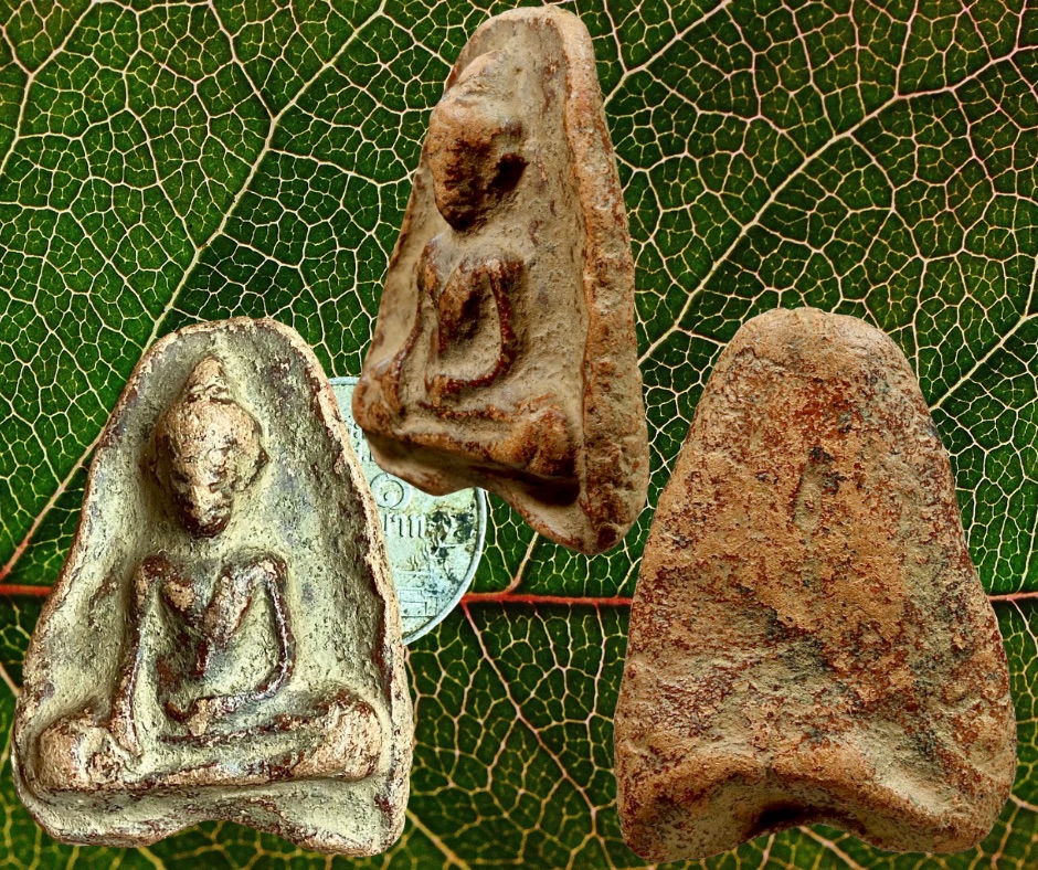 พระร่วงนั่งเข่ากว้างกรุ สปจ. กำแพงเพชร พบพระกรุนี้เมื่อมีการปรับพื้นที่สร้างสำนักงานการประถมศึกษาของจังหวัด ซึ่งพื้นที่แห่งนี้อยู่ในกำแพงเมืองเก่าฝั่งจังหวัด ฯ สันนิษฐานว่าเคยเป็นที่ตั้งของโบราณสถานเก่าแก่และไม่เหลือเค้าโครงปรากฎให้เห็น .พระกรุนี้พบหลายพิมพ์ส่วนใหญ่เป็นเนื้อดิน พิมพ์ที่นิยมและรู้จักกันแพร่หลายคือพิมพ์ “พระร่วงนั่งซุ้มประสาท” และ “พระร่วงนั่งเข่ากว้าง” องค์ที่นำมาเสนอนี้เนื้อดินเผาแก่ไฟไหม้ดำสภาพสมบูรณ์หย่อนงามมาเดิมจากกรุ ขนาด 2.5 x 4.0 ชม. 2,000.- บาท