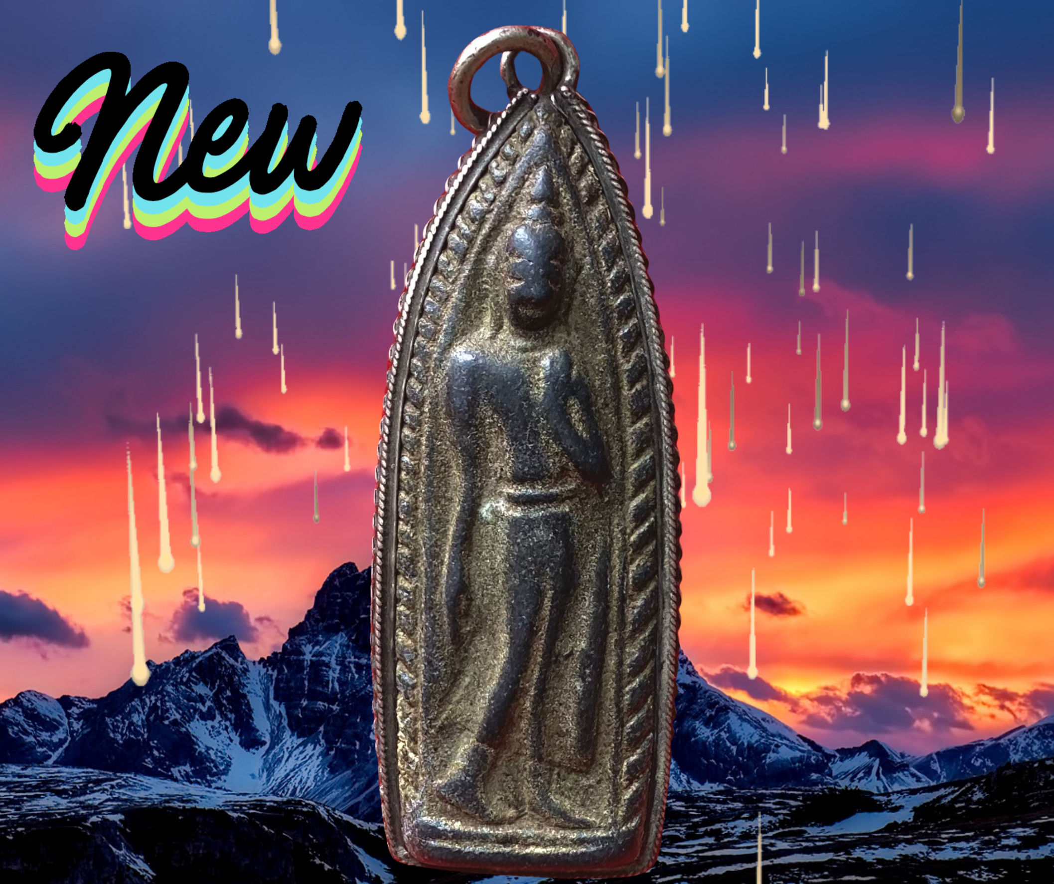 พระลีลาข้างขีดเนื้อชินเขียวกรุวัดถ้ำหีบ สุโขทัย ส่วนมากที่พบจะเป็นเนื้อดินเนื้อชินและเนื้อว่านพบน้อย แยกเป็นสองแบบ ๆ ศอกนอกและศอกใน องค์นี้แบบศอกในเลี่ยมเงินโบราณโดยฝีมือช่างจิวเวลรี่รุ่นเก่าที่สุโขทัย องค์พระขนาด 2.5 x 7.0 ซม. 1,800.- บาทครับ.
