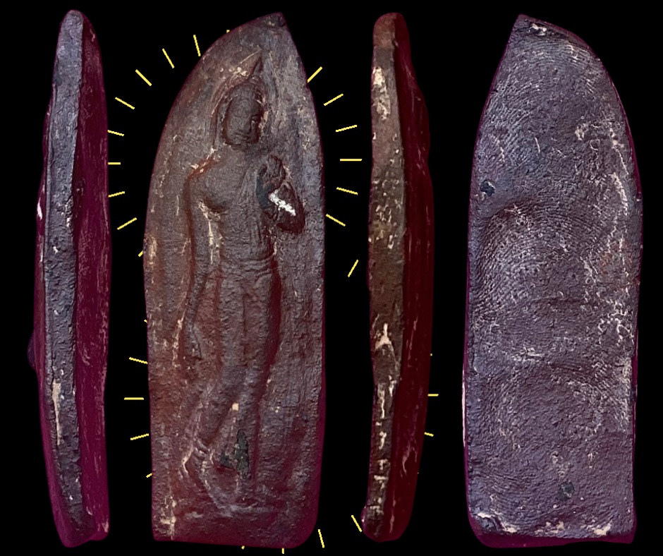 พระลีลากล้วยตากหรือลีลาฝักดาบ สุโขทัย มีขึ้นมาหลายกรุ.- วัดมหาธาตุ วัดเขาพนมเพลิง แต่ที่เหมือนกันมีสองกรุ.- พญาดำและเตาทุเรียง น่าจะเป็นพิมพ์เดียวกัน (ลายเส้นเหมือนกัน) ต่างกันที่เนื้อพญาดำจะละเอียดคล้ายเนื้อกำแพงเพชร เตาทุเรียงจะหยาบเหมือนพิมพ์อื่น ๆ ที่เรามักจะเรียกกันว่าเนื้อเตา องค์นี้กรุเตาทุเรียงพิมพ์ใหญ่เนื้อแกร่งคล้ายใหกะเทียมเผาเคลือบ สภาพสวยสมบูรณ์ ขนาด 2.5 x 8.0 ซม. 2,500.- บาทครับ. http://www.winitcq.com