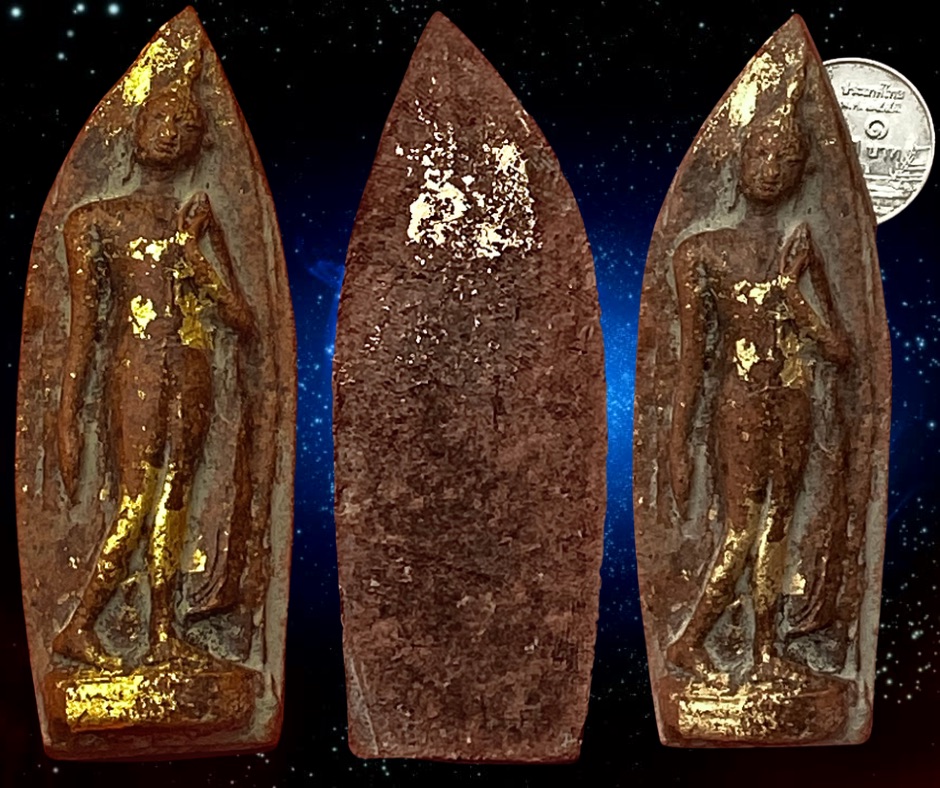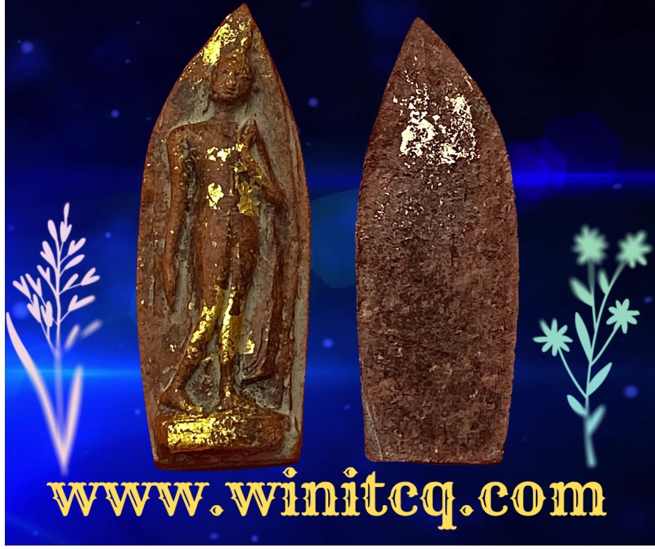 พระลีลากรุวัดถ้ำหีบ สุโขทัย วัดถ้ำหีบเป็นวัดร้างในถ้ำเขากิ่วอ้ายมาเทือกเขาประทักษ์ สร้างในสมัยกรุงสุโขทัยเป็นราชธานี ชาวบ้านเข้าไปในถ้ำพบไหเคลือบหลายใบบรรจุพระปางลีลาเนื้อดินเผาขนาดใหญ่กว่าพระลีลาทั่วไป เนื้อสีแดงจะแกร่งมากกว่าสีเหลือง ถ้าเคาะเสียงจะดังกังวาน มีทั้งเนื้อดินหยาบและดินละเอียด บางองค์ก็ปิดทองล่องชาดมาด้วย นอกจากเนื้อดินแล้วยังพบเนื้อชินและเนื้อว่านด้วยแต่มีจำนวนน้อย แยกออกเป็น 2 พิมพ์คือพิมพ์ลีลาและพิมพ์ลีลาข้างเม็ด และยังจำแนกต่อไปอีก 2 แบบคือแบบศอกนอกและศอกใน นอกจากพบที่วัดถ้ำหีบแล้วยังพบที่กรุวัดเจดีย์งามและวัดเขาพระบาทน้อยด้วย องค์ที่นำมาเสนอองค์นี้ขนาด 3 x 8.5 ซม. สภาพสวยสมบูรณ์ หู ตา ปาก จมูก ชัด 3,500.~ บาทครับ.
