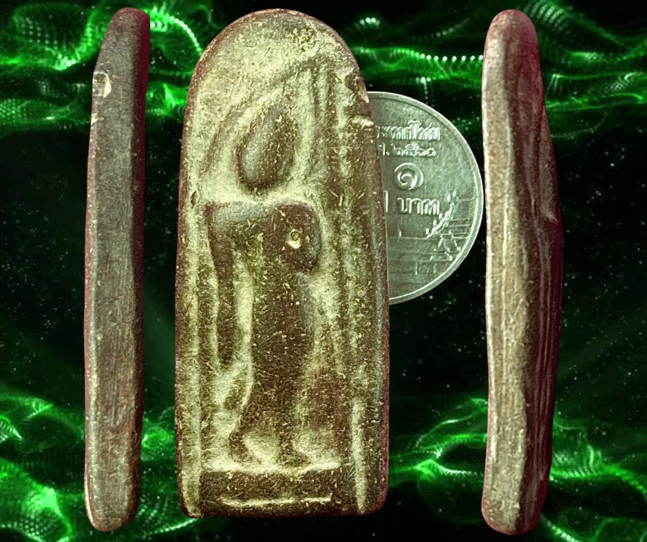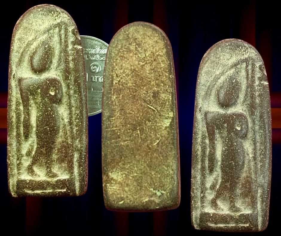 พระลีลาปากเป็ดกรุวัดพิกุล กำแพงเพชร พระลีลาพิมพ์นี้น่าจะขึ้นมาน้อยจึงไม่ค่อยพบเห็น พุทธลักษณะคล้ายพระกำแพงเม็ดขนุนกรุวัดป่ามืดแต่พระกำแพงปากเป็ดเศียรจะเอียงซ้าย แขนซ้ายยกมือขึ้นทาบอก แขนขวาเหยียดตรง มีซุ้มครอบแก้วคลุมองค์พระ พื้นผนังเรียบ ขนาด 1.7 x 4.5 ซม. 1,800.- บาทครับ. (ถ้าพิมพ์ของหลวงพ่อกวยองค์พระจะผอมกว่าและไม่ตัดฐาน)