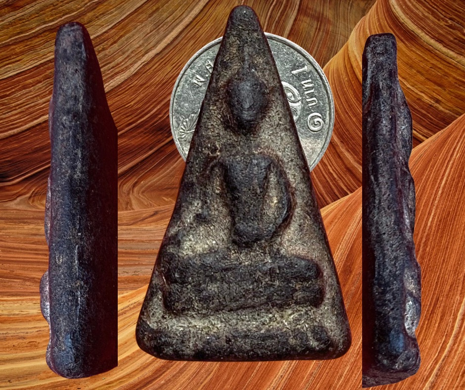 พระนางพญาเหล็กเปียกเนื้อว่าน กรุวัดพระธาตุพนม นครพนม เมื่อ 18 ส.ค. 2518 พระธาตุพนมล้มเพราะฝนตกหนัก 3 วัน 3 คืน พระเณรและญาติโยมจึงได้ช่วยกันเก็บ พระเก่า ๆ ที่บรรจุอยู่ในพระธาตุและ ปลียอดพระธาตุที่ฉีกขาด (บางท่านเรียกเหล็กเปียก) นำมาหล่อพระเป็นรูปแบบพระเชียงรุ้ง ใช้พระนางพญาในกรุพระธาตุพนมที่ล้มเป็นแม่แบบพิมพ์ ใช้ปลียอดพระธาตุ+ชิน+ตะกั่วผสมเทหล่อเป็นองค์พระ ตั้งชื่อ “พระนางพญาเหล็กเปียก” องค์นำเสนอนี้เป็นพระเนื้อว่าน สร้างโดยราชครูโพนสะเม็กหรือ “ญาครูขี้หอม” สร้างบรรจุไว้เมื่อตอนมาบูรณะพระธาตุพนมในปี 2233 สภาพสมบูรณ์ ขนาด 2.5 x 4.0 ซม. 600.- บาทครับ.
