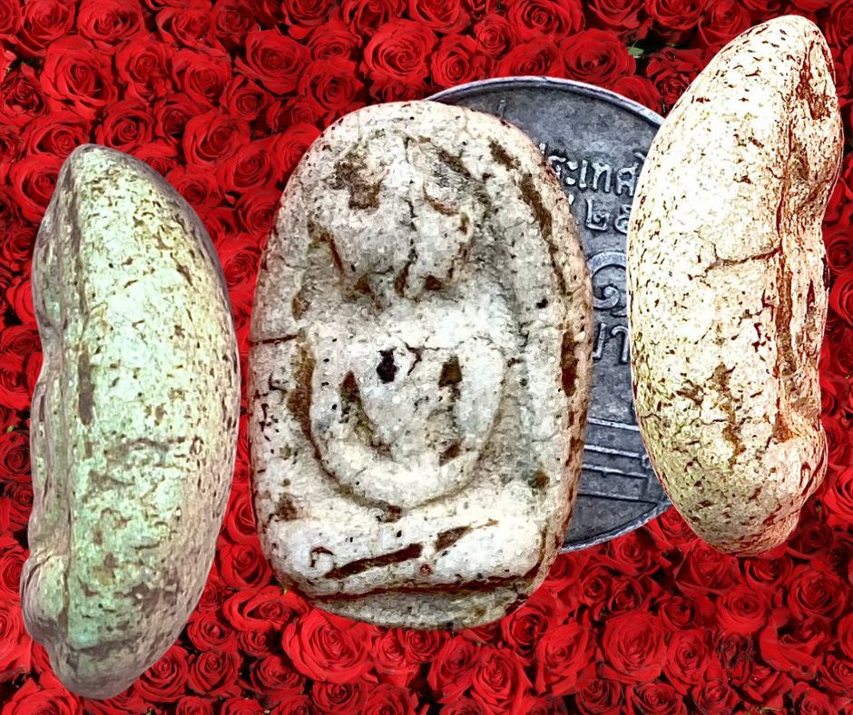 พระกรุวัดอัมพวา ธนบุรี (กทม.) สมเด็จพระพุทธโฆษาจารย์ (ฤทธิ์) อดีตเจ้าอาวาสวัดอรุณราชวรารามเป็นผู้สร้างด้วยผงชื่อ “ผงกลับศัตรูเป็นมิตร” แล้วบรรจุไว้ในเจดีย์หลังโบสถ์เมื่อคราวปฏิสังขรณ์วัดอัมพวาประมาณปี 2450 จำนวนมากกว่า 50 พิมพ์ ปี 2484 เกิดสงครามอินโดจีน พระครูแป้นได้เปิดกรุนำพระจำนวนหนึ่งออกแจกทหารและชาวบ้านเพื่อคุ้มภัย องค์ที่นำมาเสนอนี้พิมพ์เข่ากว้าง สภาพสมบูรณ์คราบกรุจับเต็ม หน้า-หลัง ขนาด 1.3 X 2.3 ซม. 700.- บาทครับ.