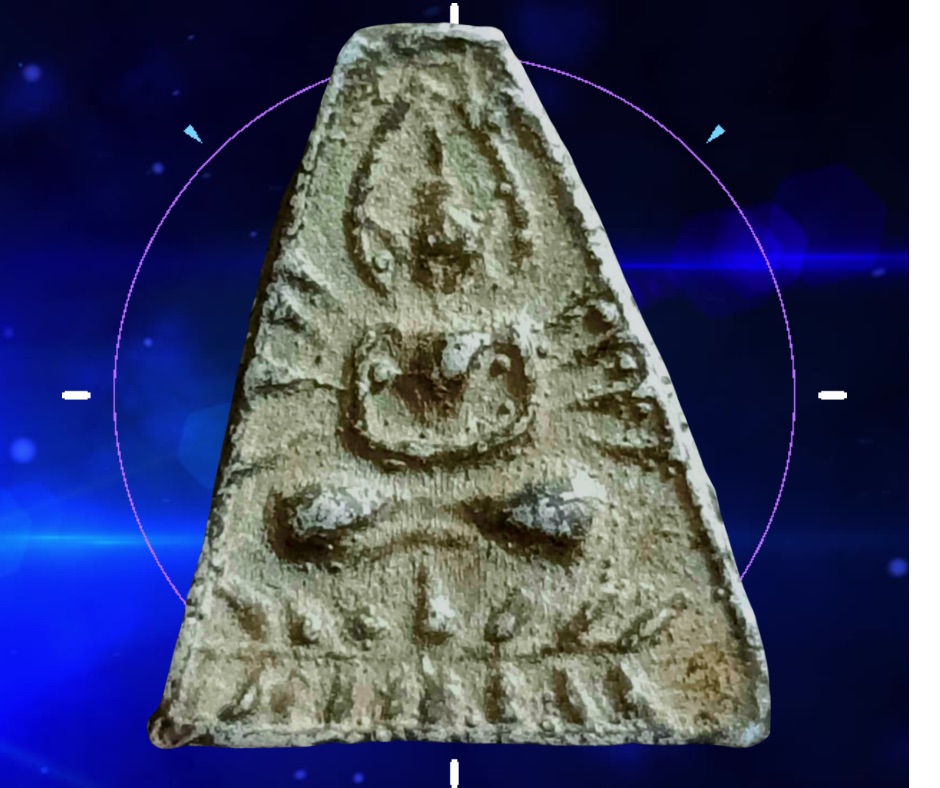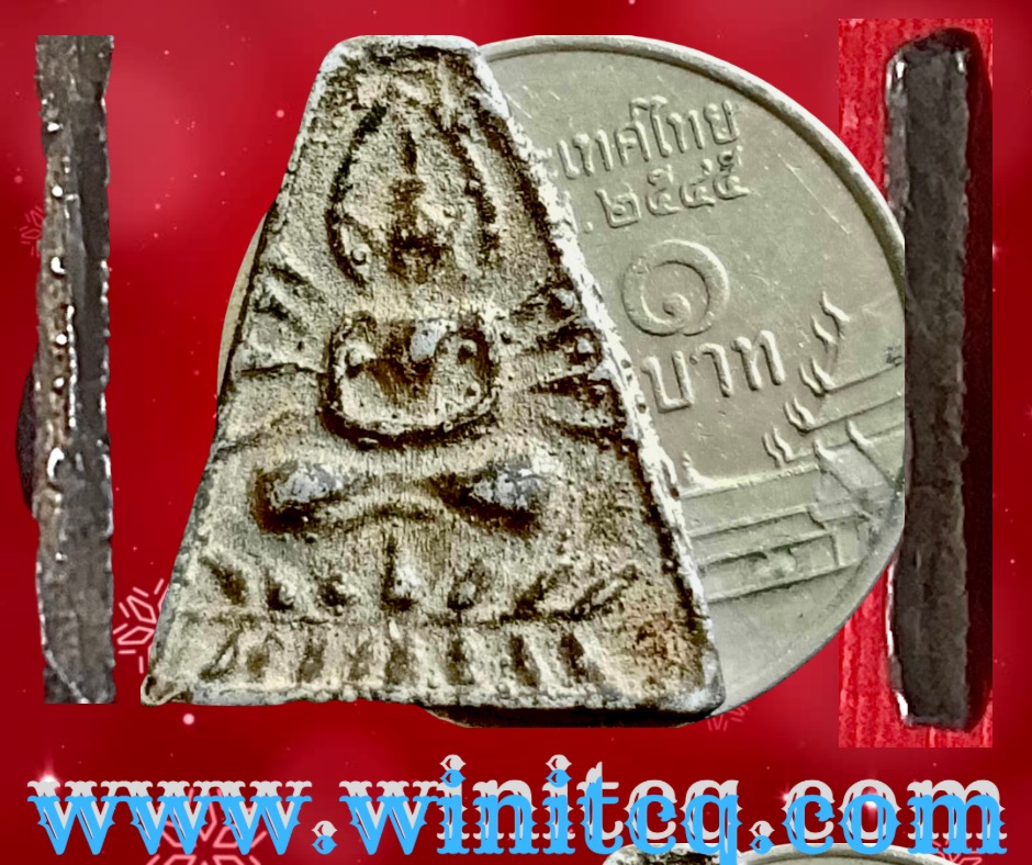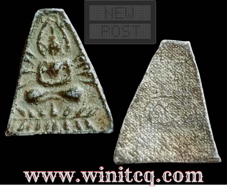 พระสามเหลี่ยมประภามณฑลข้างรัศมีเนื้อชิน (แก่ตะกั่ว) หลังจารหลวงปู่ศุข วัดปากคลองมะขามเฒ่า ชัยนาท เป็นพิมพ์แจกแม่ครัวแต่ไม่ใช่รุ่นแจกแม่ครัว กรรมวิธีการสร้างเป็นพิมพ์หล่อตัดสิ่ว ขนาด 1.5 x 2.0 ซม. ประวัติว่าหลวงปู่ศุขท่านได้สร้างและนำแจกเมื่อคราวทำศพโยมมารดาของท่านเป็นครั้งแรกร่วมกับพิมพ์อื่น ๆ ในปี 2463 “หลายคนหลายความคิดต่างมุมมอง” 1,500.- บาทครับ.
