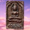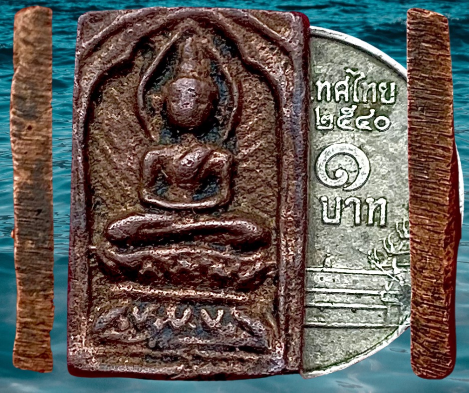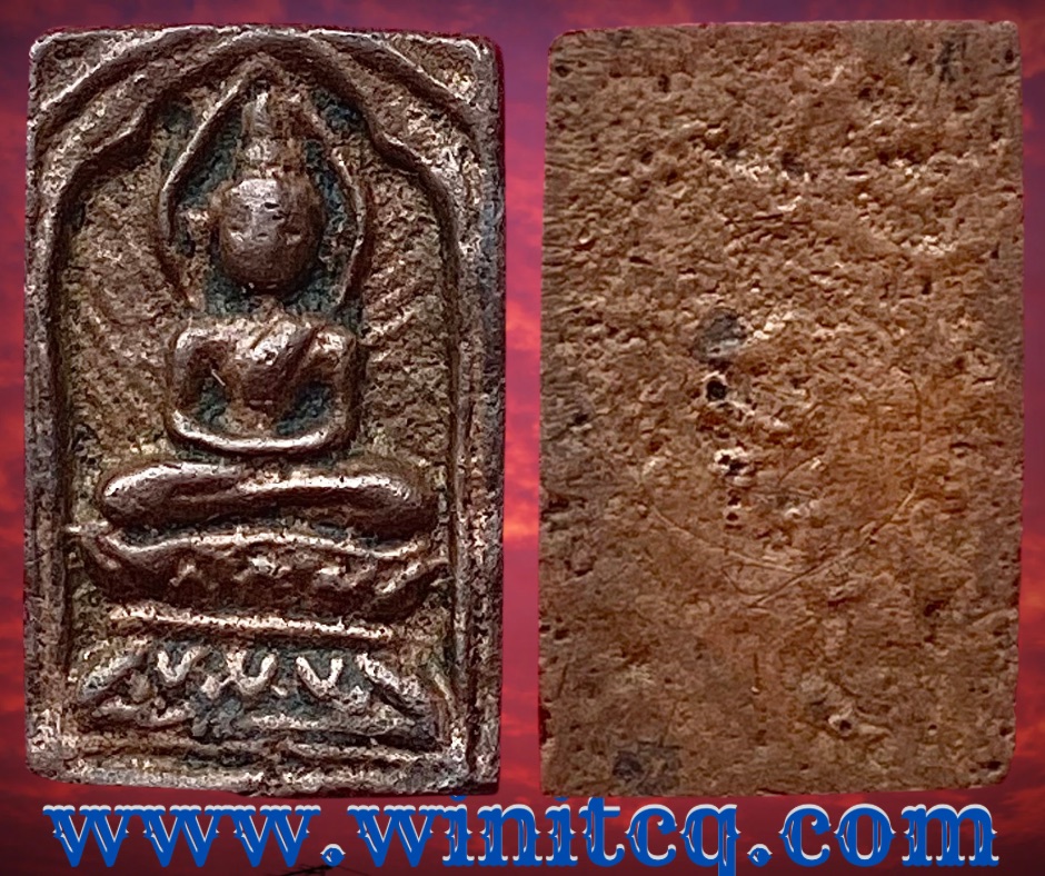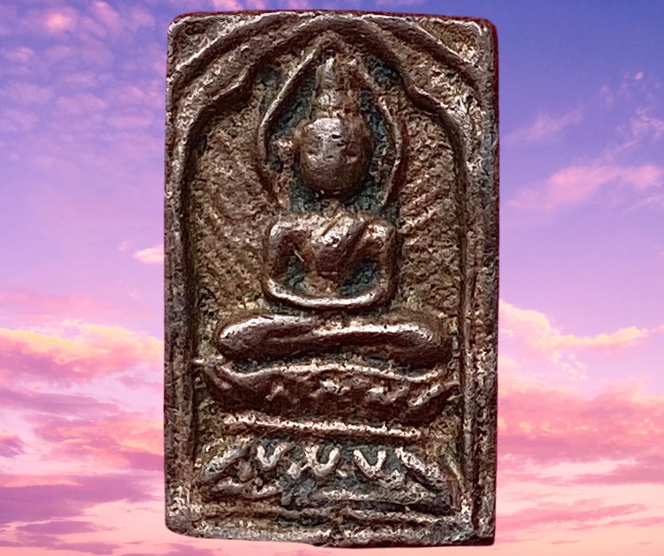 พระสี่เหลี่ยมประภามณฑลข้างรัศมีเนื้อทองแดงหลังจาร หลวงปู่ศุข วัดปากคลองมะขามเฒ่า ชัยนาท หลวงปู่ศุขสร้างพิมพ์สี่เหลี่ยมประภามณฑลก่อนปี 2450 ส่วนมากมักจะทําด้วยเนื้อตะกั่วผสมปรอท เพราะเป็นวัสดุที่หาได้ง่าย ทําได้ครั้งละจํานวนมาก …เนื้อทองแดงผสมหลวงปู่ศุขสร้างประมาณปี 2460 ในปลายอายุขัยของท่านสร้างจำนวนน้อย ที่สําคัญได้ช่างออกแบบพิมพ์จากช่างหลวงที่พระองค์เจ้ากรมหลวงชุมพรเขตอุดมศักดิ์ ท่านทรงให้ออกแบบและมอบทองแดงให้มาสร้างในครั้งนี้ องค์นำเสนอนี้ปัจจุบันเรียกเนื้อทองแดงเถื่อนสภาพสมบูรณ์ ตะไบหยาบทั้งสี่ด้าน ขนาด 1.5 x 2.0 ซม. 2,200.- บาทครับ.