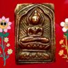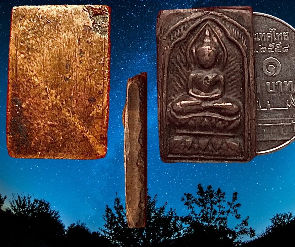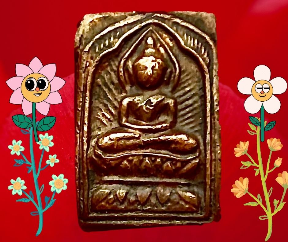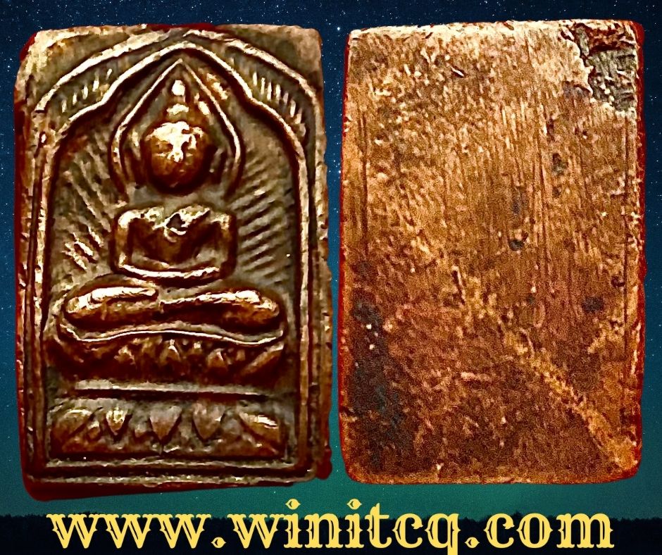 พระสี่เหลี่ยมประภามณฑลข้างรัศมีเนื้อทองแดงหลังจาร หลวงปู่ศุข วัดปากคลองมะขามเฒ่า ชัยนาท หลวงปู่ศุขสร้างพิมพ์สี่เหลี่ยมประภามณฑลก่อนปี 2450 ส่วนมากมักจะทําด้วยเนื้อตะกั่วผสมปรอท เพราะเป็นวัสดุที่หาได้ง่าย ทําได้ครั้งละจํานวนมาก …เนื้อทองแดงผสมหลวงปู่ศุขสร้างประมาณปี 2460 ในปลายอายุขัยของท่านสร้างจำนวนน้อย ที่สําคัญได้ช่างออกแบบพิมพ์จากช่างหลวงที่พระองค์เจ้ากรมหลวงชุมพรเขตอุดมศักดิ์ ท่านทรงให้ออกแบบและมอบทองแดงให้มาสร้างในครั้งนี้ องค์นำเสนอนี้ปัจจุบันเรียกเนื้อทองแดงเถื่อนสภาพหน้าตาพอมองเห็น สิ่วตัดสองข้าง ขนาด 1.5 x 2.0 ซม. 3,000.- บาทครับ.