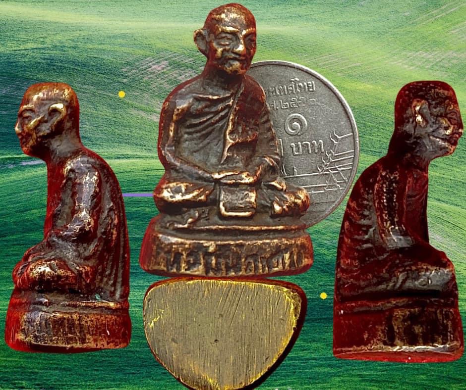 พระหล่อรูปเหมือนหลวงพ่อขอมเนื้อทองผสมปี 2505 วัดไผ่โรงวัว สุพรรณบุรี รูปหล่อรุ่นแรกสร้างปี 2497 รุ่นสองปี 2500 รุ่นสามปี 2505 รุ่นนี้สร้างหลายพิมพ์มีบรรจุกริ่งและไม่บรรจุกริ่ง องค์นำเสนอนี้สภาพสมบูรณ์ปี 2505 ฐานเรียบไม่บรรจุกริ่ง ขนาด 1.8 x 3.0 ซม. 500.- บาท