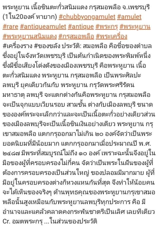 พระหูยานพิมพ์ใหญ่เนื้อตะกั่วสนิมแดง กรุสมอพลือ เพชรบุรี แตกกรุปี 2487 ประมาณยี่สิบองค์ หนึ่งในยี่สิบองค์นี้ เพื่อนร่วมรบในสงครามเวียตนามใต้ให้ไว้เป็นที่ระลึกก่อนจากกันเมื่อปี 2514 เพิ่งค้นพบในกล่องผุ ๆ นำมาชมกัน (ไม่มีราคานะ)
