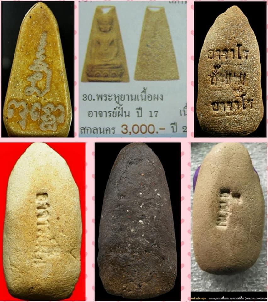 พระหูยานเนื้อผงน้ำมันหลวงปู่ฝั้น วัดป่าอุดมสมพร สกลนคร ปี 2517 พระสายวัดป่าที่มีผู้สร้างวัตถุมงคลนำมาให้อธิฐานจิตมากที่สุด กล่าวกันว่าท่านสำเร็จเป็นพระอรหันต์ มรภาพปี 2520 พระหูยานชุดนี้ด้านหลังปั้มยันต์ ปั้มชื่อ และหลังเรียบ องค์ที่นำเสนอนี้ด้านหลังปั้ม “อาจารย์ฝั้น” ชุดนี้มีน้อยยากจะพบเห็น 900.- บาท ส่งด่วนประกันแท้ครับ.