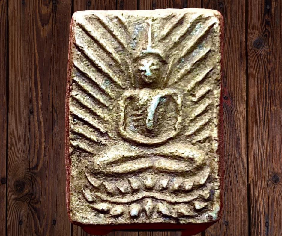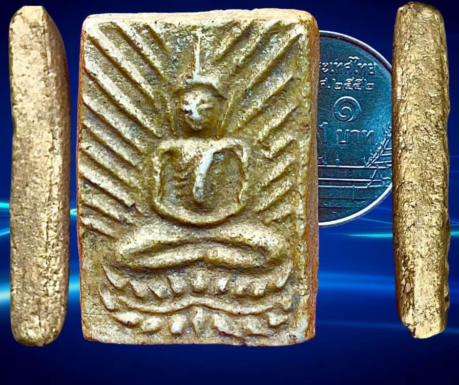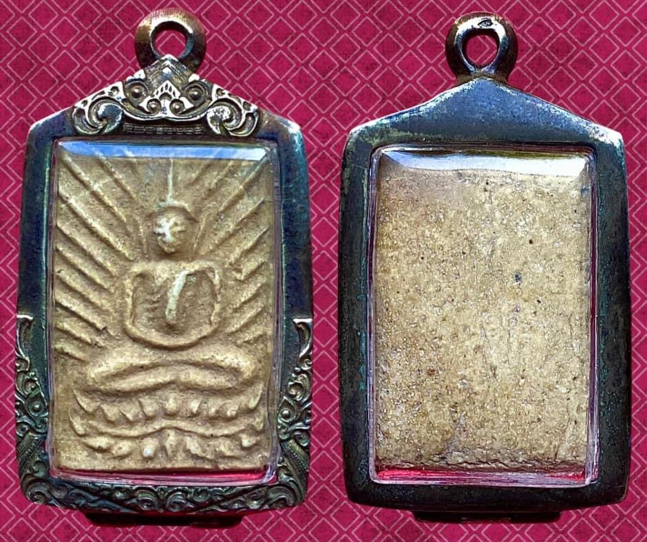 พระเนื้อผงรุ่นสร้างพระเจดีย์ พิมพ์สี่เหลี่ยมรัศมีฐานบัวเลื้อย ปี 2496