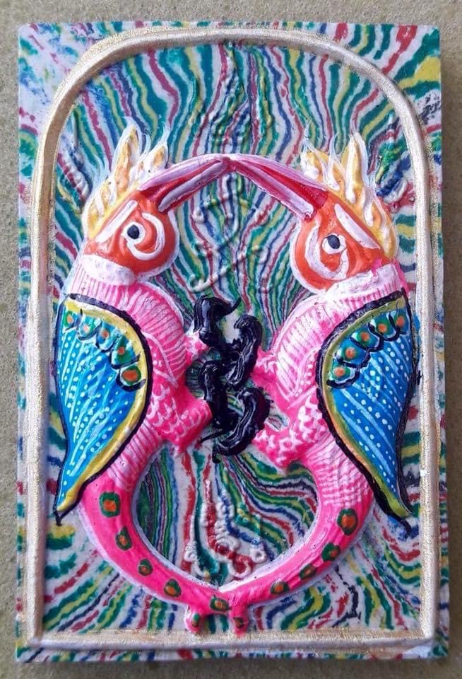 สาลิกาคู่พิมพ์ใหญ่หางเกี้ยว สาลิกาพิมพ์นี้เป็นบล็อกเหล็กเปิดตัวเป็นทางการที่สำนักสงฆ์เวฬุวัน เมื่อต้นปี 2552 พร้อมกันทั้งพิมพ์ใหญ่และพิมพ์เล็ก เรียกกันว่ารุ่นสร้างแท๊คน้ำ เพราะนำปัจจัยที่ได้จากการเช่าบูชามาสร้างแท๊คน้ำไว้ใช้ที่สำนักนักสงฆ์ป่าเวฬุวัน อ.วังน้ำเขียว สาริกาชุดนี้ถ้าพิจารณานาน ๆ พิมพ์ได้ส่วนเนื้อลายสวย รุ่นนี้มีสองสี ลายสีน้ำตาล และลายสีเขียว องค์นี้ลายสีเขียว size 4.5 x 6.5 cm.ครับ. 1,000.- บาท พร้อมส่ง Ems. ครับ.