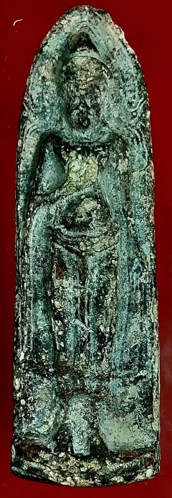คืนนี้ชมพระเก่าเก็บอีกหนึ่งองค์…พระร่วงยืนหลังรางปืนเนื้อตะกั่วสนิมแดง มีตำหนิตรงมือที่ทาบหน้าอกไขหนาใช้มีดสกิดเลยเป็นแผลนิดหน่อยนอกนั้นสมบรูณ์แต่ไม่สวย.