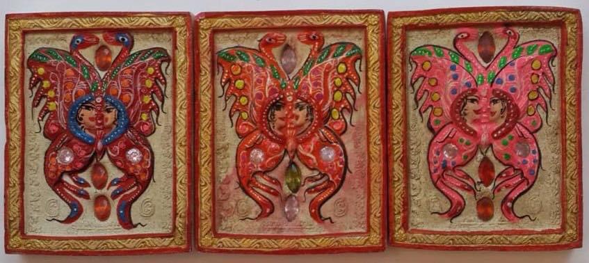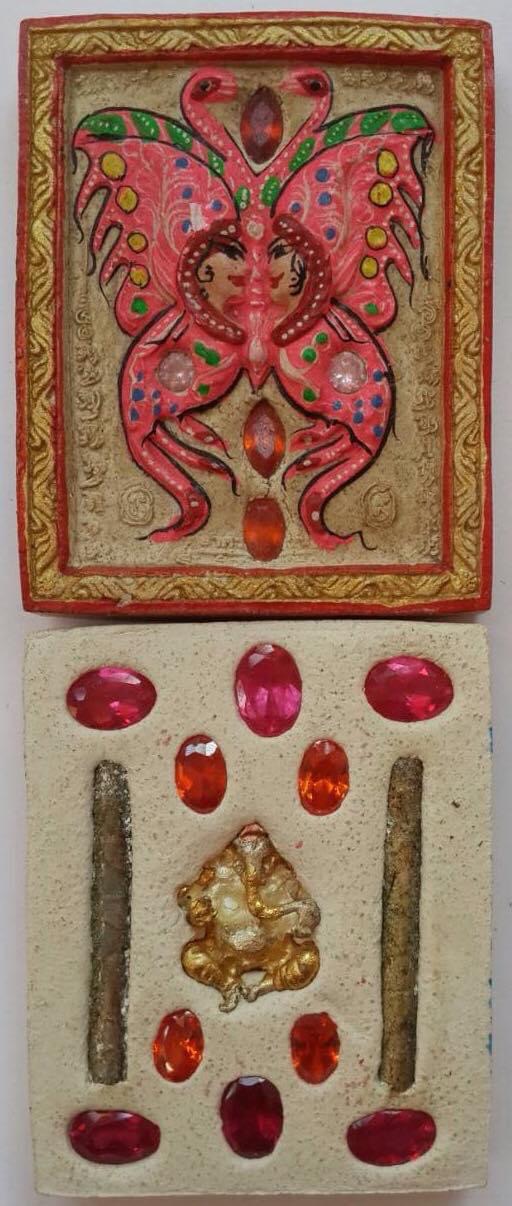 เทพจำแลงพิมพ์กลาง (อาศรมสถาน) เทพเจ้าแห่งโชคลาภ และเมตตามหานิยม ชุดนี้สร้างในพรรษาปี 2555 มีเนื้อสีขาวและเนื้อสีชมพู การฝังที่ด้านหลังจะเป็นตะกุดเงินคู่ ฝังพลอยเม็ดโตสีสวย และฝังรูปพระพิฆเนศวร รูปพระโพธิสัตว์เอาวโรกิเตศวร พระตรีมูรติ ชุบสามกษัตริย์ รวมทั้งหมดประมาณ 400 องค์ เป็นชุดเพ้นท์สวยมาจากอาศรมสถานบ้านโตนด size 3.5 x 4.5 cm. ครับ.2,000.-