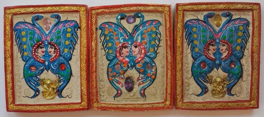 เทพจำแลงพิมพ์กลาง (อาศรมสถาน) เทพเจ้าแห่งโชคลาภ และเมตตามหานิยม ชุดนี้สร้างในพรรษาปี 2555 มีเนื้อสีขาวและเนื้อสีชมพู การฝังที่ด้านหลังจะเป็นตะกุดเงินคู่ หรือตะกุดสี่ทิศ ฝังพลอยเม็ดโตสีสวย และฝังรูปพระพิฆเนศวร รูปพระโพธิสัตว์กวนอิม พระตรีมูรติ ชุบสามกษัตริย์ รวมทั้งหมดประมาณ 400 องค์ เป็นชุดเพ้นท์สวยมาจากอาศรมสถานบ้านโตนด size 3.5 x 4.5 cm. 2,000.- บาทครับ.