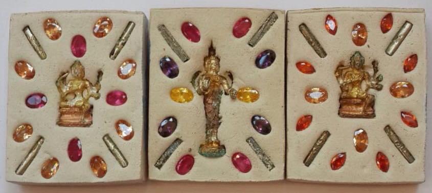 เทพจำแลงพิมพ์กลาง (อาศรมสถาน) เทพเจ้าแห่งโชคลาภ และเมตตามหานิยม ชุดนี้สร้างในพรรษาปี 2555 มีเนื้อสีขาวและเนื้อสีชมพู การฝังที่ด้านหลังจนะเป็นตะกุดเงินคู่ หรือตะกุดสี่ทิศ ฝังพลอยเม็ดโตสีสวย และฝังรูปพระพิฆเนศวร รูปพระโพธิสัตว์กวนอิม พระตรีมูรติ ชุบสามกษัตริย์ รวมทั้งหมดประมาณ 400 องค์ เป็นชุดเพ้นท์สวยมาจากอาศรมสถานบ้านโตนด size 3.5 x 4.5 cm. 2,000.- บาทครับ
