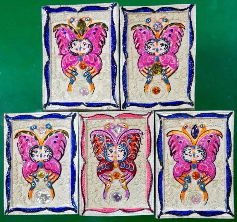 เทพสององค์คือ พระพักตร์พระศิวะมหาเทพหันหน้าเข้าหาพระพักตร์พระแม่อุมาเทวี อันเป็นสื่อความหมายถึงความสมดุลของสรรพสิ่ง การฝังมงคลต่าง ๆ ก็เพื่อเป็นการเสริมให้วัตถุมงคลเหล่านั้นมีพลังจากดวงดาว อันเป็นการนำมงคลเข้าสู่ตัวของผู้บูชาตามหลักของโหราศาสตร์ เทพฟ้าดินพิมพ์เล็กชุดนี้สร้างประมาณสองร้อยเมื่องานสรงน้ำสงกรานต์ที่อาศรมสถานบ้านโตนดปี 2556 size 2.5 x 3.5 cm.ครับ. 400.-