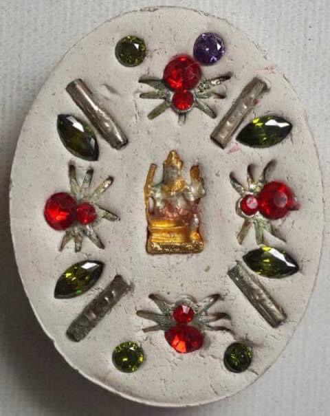 Thep jamlang oval mold, this bacth blessing 7 days in Khammathan event, on middle of Oct 2011. Front side put color stone gems and Pha-Pika-nature (the god of lucky fortune) or Pha-Prom (the god of lucky fortune) tri-color. Back side put silver roll sheet in 4 angle around with spider gems and color stone gems. Lssued only 100 + 100 and 119 gold roll pcs. Nice painting from originator size 3 x 4 cm. THB 1200.Interested please pm.
