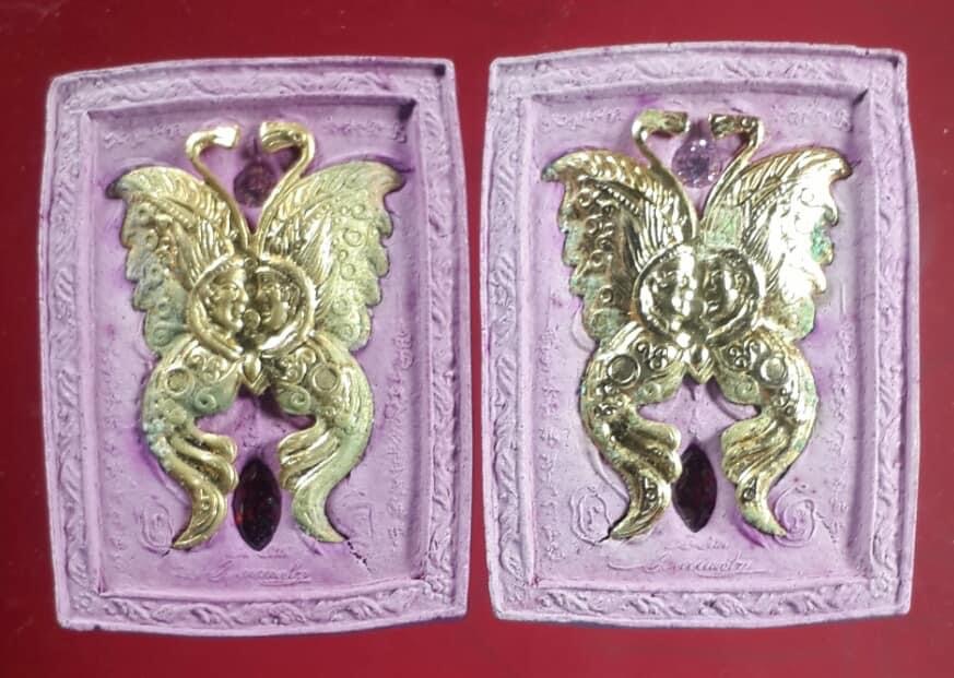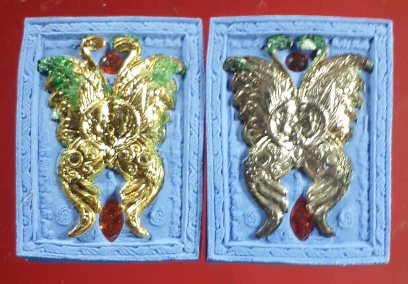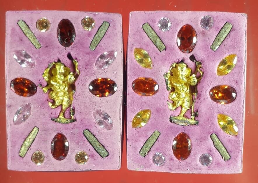 Thep jamlang tiny small mold (hermitage place), the goddess of fortune. Metta Maha and a popular new type of Asom jamlang this model issued in wai-kru event in Feb, 27-28, 2013, There are 4 color (.red, white, light blue, violet ) total 5000 pcs. Infront put money mask or gold mask of Thep jamlang. Back side put pha-pika nature (the god of lucky fortune) with 4 silver Ta-krud with many nice stone gems. 700 THB. contack with me.