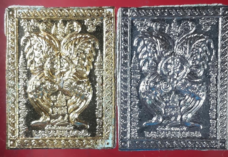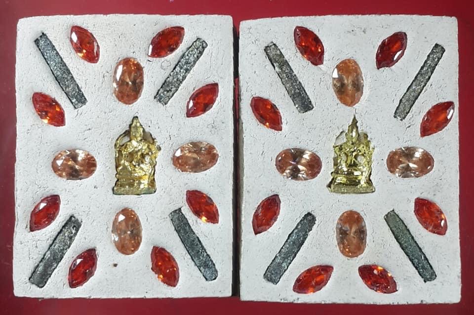 Thep jamlang mask small mold “C” (hermitage place), the goddess of fortune. Metta Maha and a popular new type of Asom jamlang. Issued on hermitage place at Ban Thanode on 7 day Ghammathan 2012. There are 2 color ( white, pink ) total 2000 pcs. Infront put money mask or gold mask of Thep jamlang. Back side put pha-phom (the god of lucky fortune) with 4 silver Ta-krud with many nice stone gems, size 2.6 x 3.5 cm. 900 THB.Contac with me.
