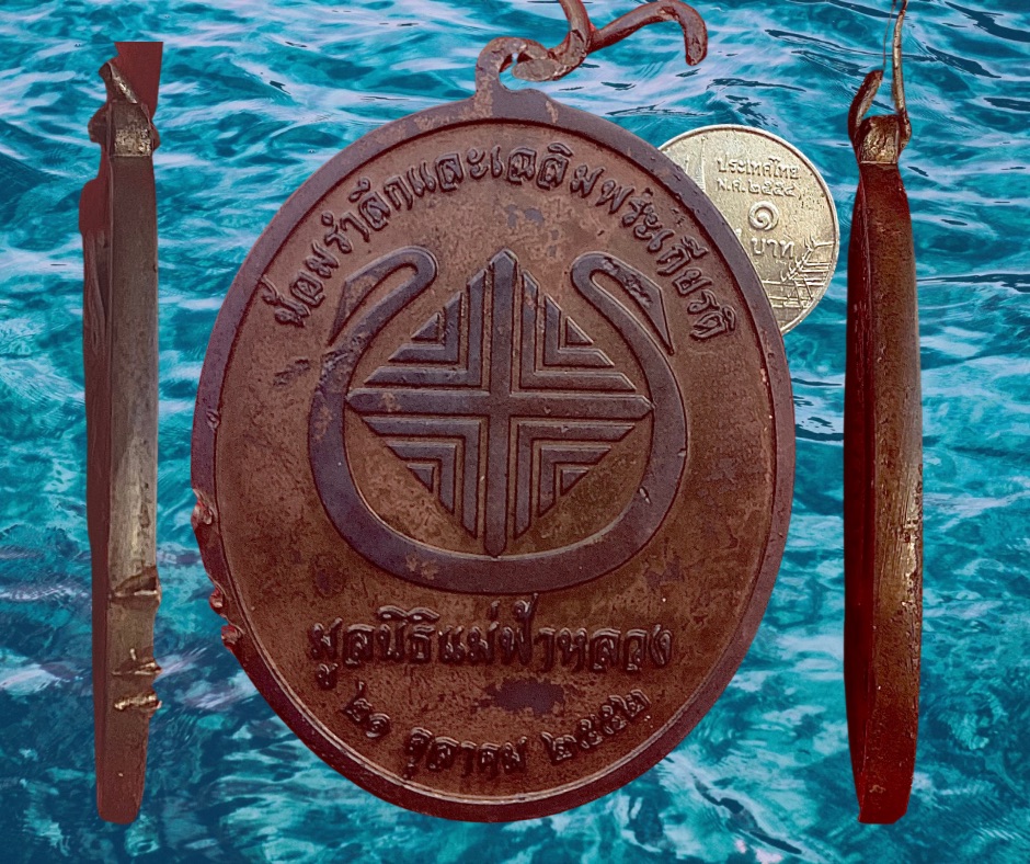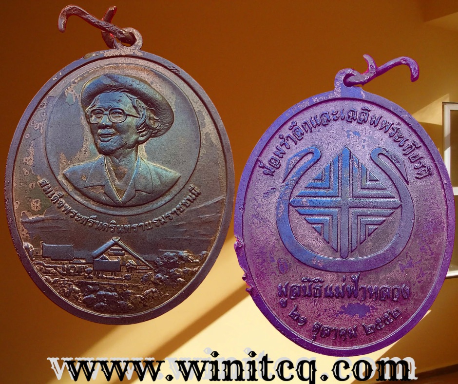 เหรียญหล่อที่ระลึกมูลนิธิแม่ฟ้าหลวง ในพระบรมราชูปถัมภ์ ปี 2552 สมเด็จพระศรีนครินทราบรมราชินี (สมเด็จย่า) ก่อตั้งขึ้นในปี 2515 เดิมชื่อว่ามูลนิธิส่งเสริมผลผลิตชาวเขาไทย ในพระอุปถัมภ์สมเด็จพระศรีนครินทราบรมราชชนนี มีเป้าหมายในการทำการตลาด ส่งเสริมการจำหน่ายผลิตภัณฑ์งานหัตถกรรมราษฎร ชาวไทยภูเขา และให้ความช่วยเหลือในด้านอื่น ๆ ต่อมา เปลี่ยนเป็นมูลนิธิแม่ฟ้าหลวง ในพระราชูปถัมภ์สมเด็จพระศรีนครินทราบรมราชชนนีในปี 2528 เหรียญหล่อที่ระลึกปีนี้น่าจะสร้างน้อยมากไม่พบเห็นในสนามเลย เหรียญที่นำมาเสนอเหรียญนี้ข้างเหรียญถูกของมีคมสามแผล ขนาด 5.0 x 6.0 ซม. 500.- บาทครับ.