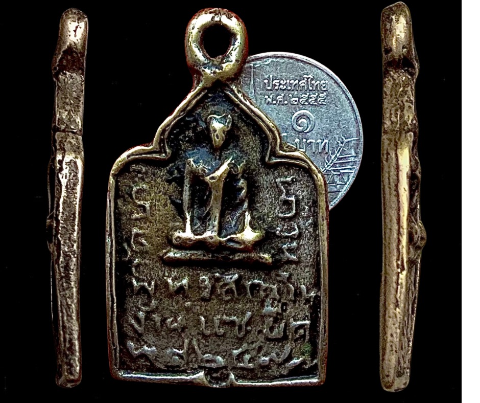 องค์นี้เป็นรุ่นสอง (ย้อนยุค) เนื้อทองผสมแก่เงิน พิเศษที่จารอักขระเต็มแผ่นหลัง ขนาด 2.2 x 4.0 ซม. 2,000.- บาทครับ.
