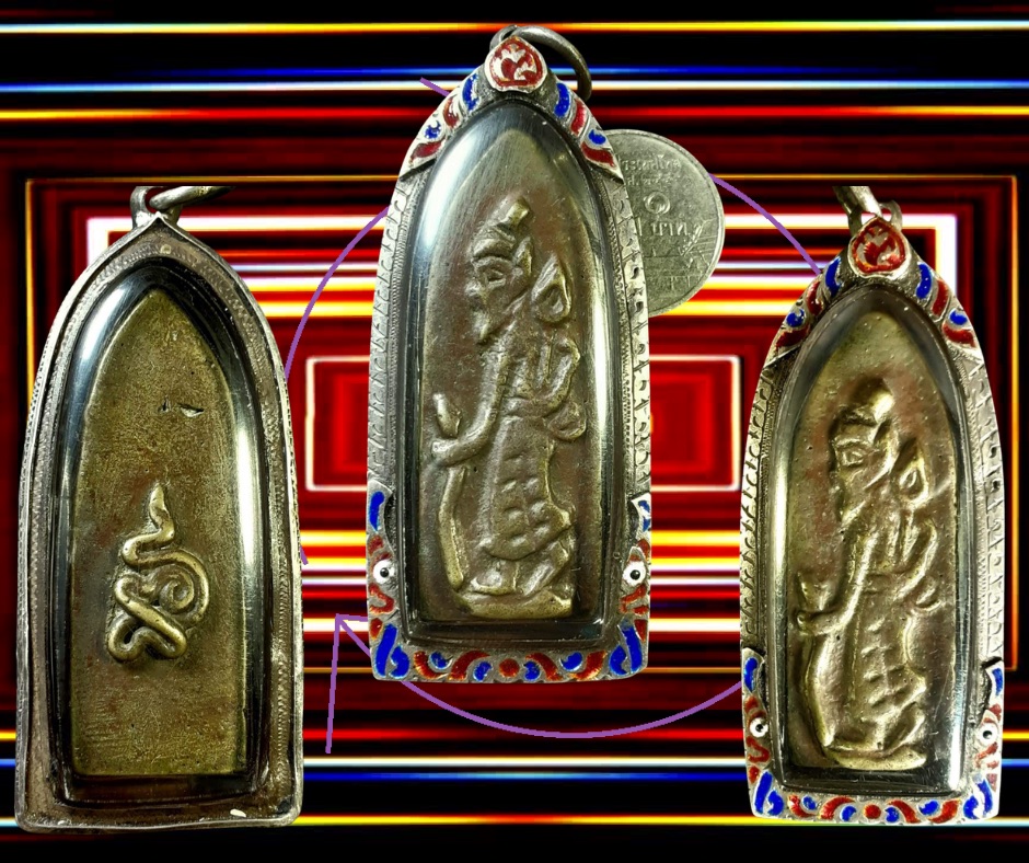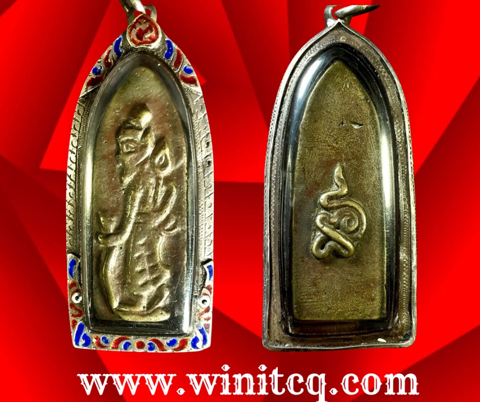 เหรียญหล่อใบพายรูปฤาษีเนื้อโลหะผสม หลวงพ่อเจ็ก วัดเขาแดงตะวันตก พัทลุง ท่านเริ่มสร้างพระเครื่องตั้งแต่ปี 2485 เป็นต้นมา โดยสร้างไปเรื่อย ๆ ครั้งละ 1 องค์บ้าง 2,5,6 องค์บ้างไม่แน่นอนด้วยตัวท่านเองปลุกเสกเอง โดยเริ่มเสกตั้งแต่การปั้นหุ่นเทียนไปจนเสร็จพิธีการ เคยมีชาวบ้านถามว่าท่านสร้างได้อย่างไร ? ท่านก็บอกว่า “ที่ฉันสร้างได้ไม่ใช่ฉันสร้างคนเดียวหรอก…แต่มีเทวดามาช่วยสร้างด้วย” ก็แสดงว่าเทวดาที่มาช่วยท่านสร้างน่าจะเป็นคนธรรพ์ มาสร้างกันตอนกลางคืน เพราะตอนกลางคืนหลวงพ่อเจ๊กท่านจะง่วนกับการสร้างวัตถุมงคลในกุฏิเพียงลำพัง แต่พอรุ่งเช้าวัตถุมงคลของท่านก็สร้างเสร็จเรียบร้อยทุกที (ข้อมูลนี้ข้าพเจ้าเคยได้พูดคุยกับลูกศิษย์ใกล้ชิดท่านเมื่อปี 2524 ครับ) องค์นำเสนอนี้ ขนาด 1.5 x 4.5 ซม. เลี่ยมเงินเก่ายกซุ้มลงยา สภาพสวยสมบูรณ์ประกันแท้ 2,500.- บาทครับ.