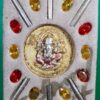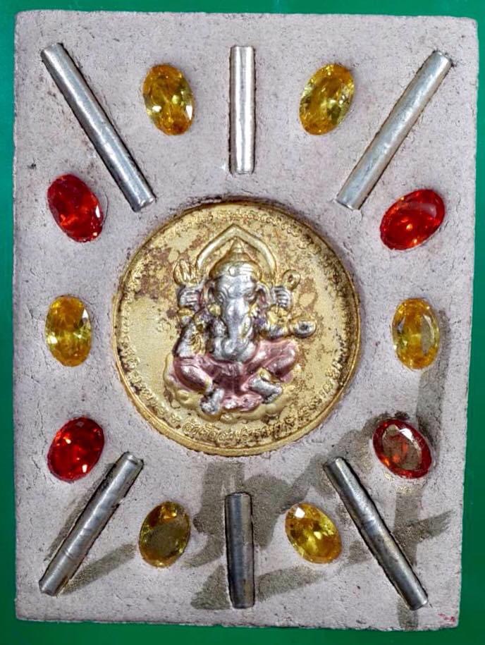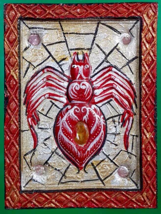 แมงมุมดักทรัพย์ชุดนี้ เนื้อสีน้ำตาลสร้างปลายเดือน มี.ค. 2555 ด้านหลังมีฝังสองแบบ ๆ ฝังเหรียญกลมรูปพระพิฆเนศวรชุบสามกษัตริย์ ฝังตะกุดเงินด้านบนสามดอก ด้านล่างสามดอกรวมหกดอก ฝังพลอยสีล้อมรอบ จำนวน 109 องค์ และอีกแบบฝังรูปพระพรมเทพธาดาชุบสามกษัตริย์ ฝังตะกุดเงินแปดดอกแปดทิศ ฝังพลอยสีล้อมรอบ จำนวน 90 องค์ รวม 199 องค์ เพ้นท์สีสวยจากอาศรม ฯ ครูบาลง อย. ด้วยหมึกสีทองที่ด้านหลัง size 3.7 x 5 cm.ครับ. 3,000.-
