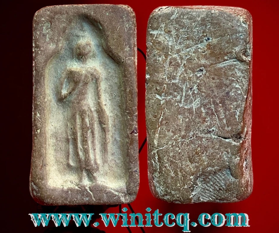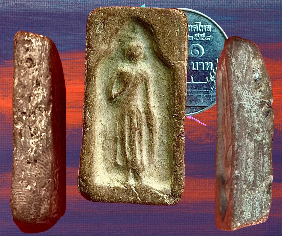 พระกำแพงหน้าอิฐกรุวัดพระบรมธาตุ กำแพงเพชร พระกำแพงหน้าอิฐเป็นพระในตระกูลกำแพงเพชรที่หาได้ยากอีกพิมพ์หนึ่งพบที่กรุวัดพระบรมธาตุจำนวนน้อยมาก ส่วนที่กรุอื่น ๆ ทั้งฝั่งทุ่ง ฯ และฝั่งจังหวัด ฯ ไม่มีท่านใดยืนยันว่าพบหรือไม่ ลักษณะเป็นพระยืนประธานพรในซุ้มเรียบและลีก องค์นำมาเสนอนี้ ขนาด 1.7 x 3.3 ซม. สภาพด้านหน้าสมบูรณ์ส่วนด้านหลังหย่อนความสวยงาม 2,000.- บาทครับ.